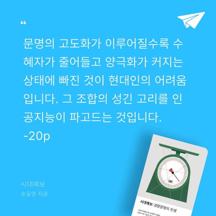 그동안 ‘핵개인’과 ‘호명사회’라는 혁신적인 키워드로 개인에 초점을 맞춰 우리 사회의 변화를 소개해온 송길영 작가가 세 번째 《시대예보》로 돌아왔다. 이번에는 ‘경량문명의 탄생’을 선언하며, 우리 사회의 모든 ‘조직’ 단위에서 일어나고 있는 변화를 날카로운 시선과 섬세한 표현으로 소개한다.