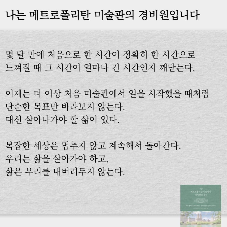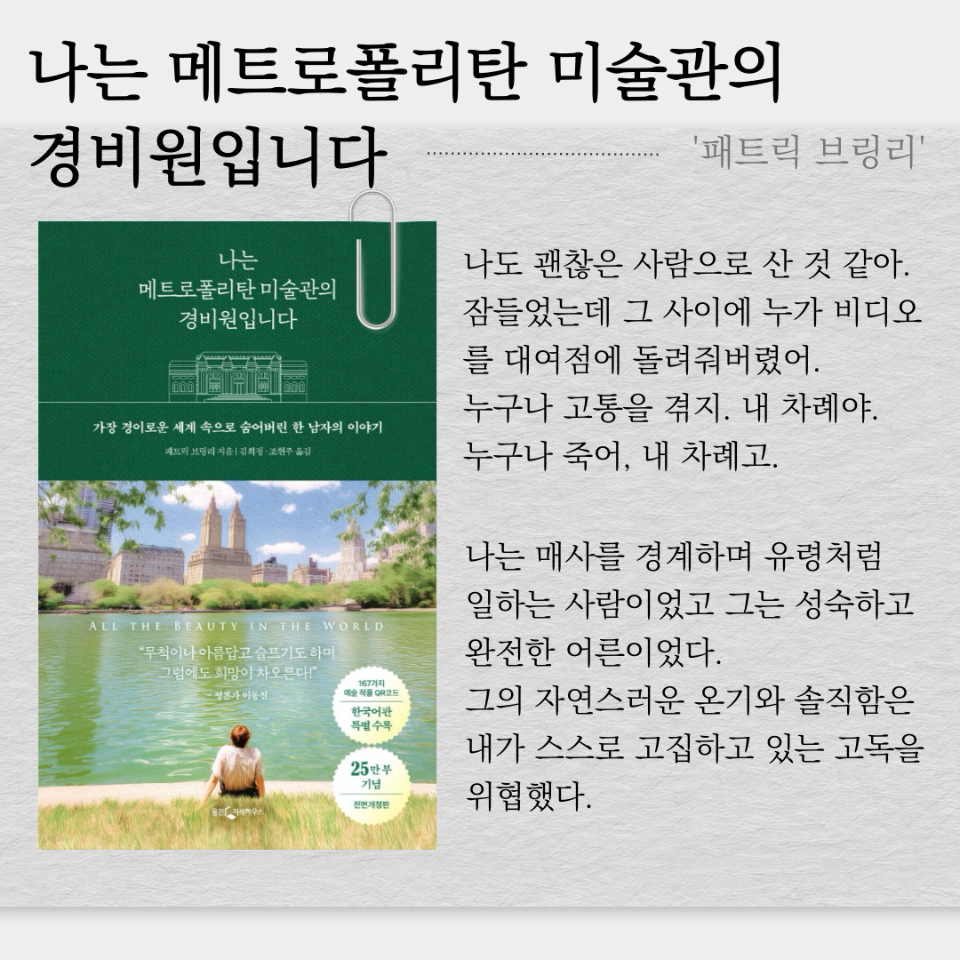 요약저자 패트릭 브링리는 뉴욕의 유명 잡지사에서 촉망받는 직원이었습니다. 하지만 사랑하는 형이 암으로 세상을 떠나자, 그는 삶의 의미를 잃고 세상으로부터 도망치듯 물러나기로 결심합니다. 그는 거대한 혼란과 슬픔을 잠재우기 위해 세계 3대 미술관 중 하나인 메트로폴리탄 미술관의 경비원이 되는 길을 택합니다. 🎨