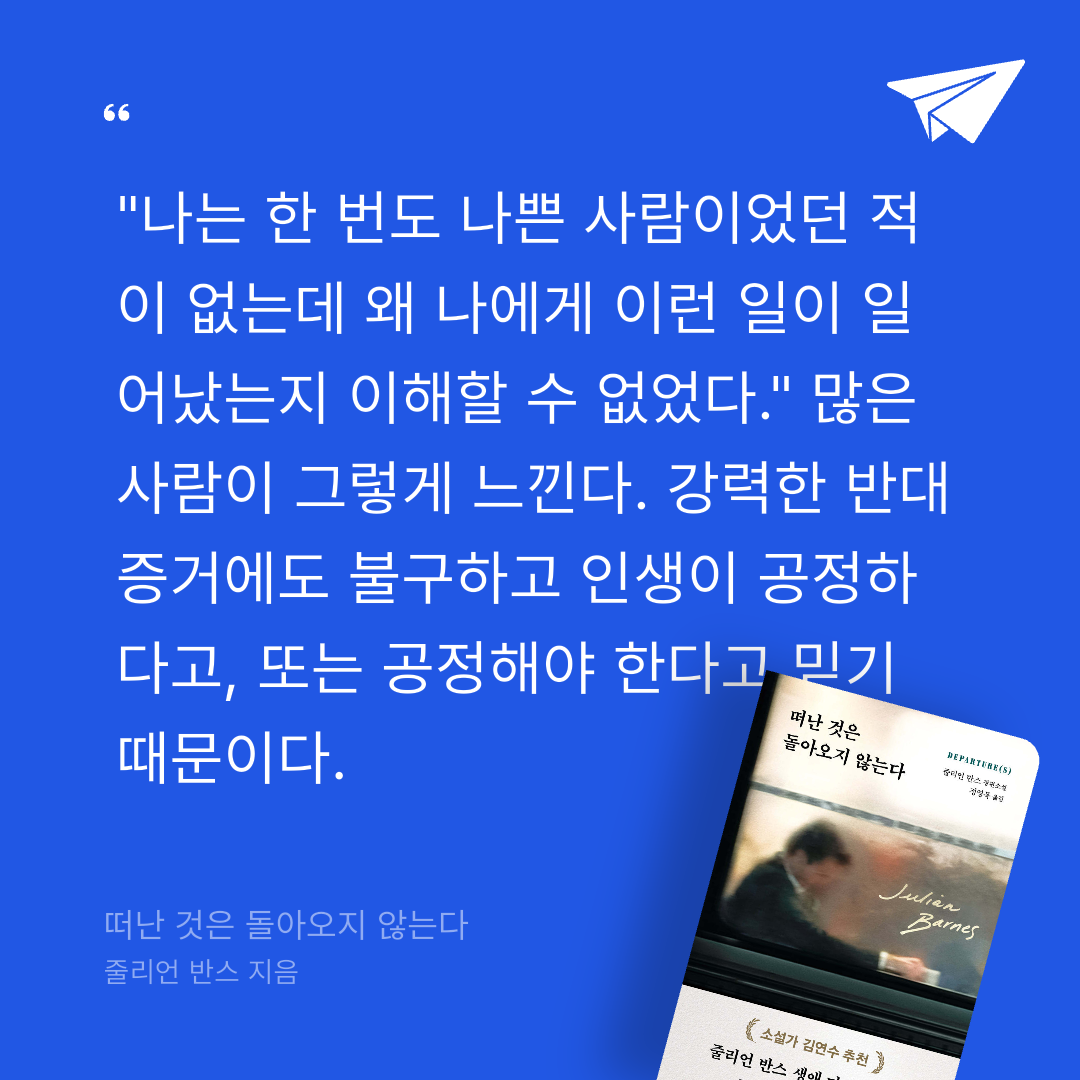 💭기억의 파편, 진실의 그림자! <떠난 것은 돌아오지 않는다>는 자신의 끝을 예감하며 집필한 자전적 소설로, 기억을 매개로 소설이라는 형식이 도달할 수 있는 인생의 가장 근원적이고 최종적인 질문을 탐색한 줄리언 반스의 생애 마지막 작품이다. 직접 저자가 이번이 마지막 소설이라고 언급한 이 작품은 반세기를 문학에 투신해 온 작가가 스스로의 끝을 의식하고 써 내려간 유언 혹은 문학적 부고와 같은 작품이다. 화려한 결산이나 업적을 나열하는 작품이 아니라, 저자의 삶과 기억을 통해 자신의 정체성을 되묻는 작품으로, 한 시대를 대표해 온 소설가가 스스로 선택한 퇴장의 형식으로 그려진 작품이다.