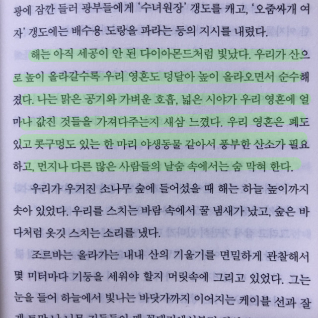 📖118. 이 사람은 많은 것을 보고 행하고 겪으면서 정신은 열리고, 마음은 넓어지고, 태초의 호기를 잃지 않았구나. 이 사람은 그의 고향 선배인 알렉산드로스 대왕처럼 우리가 풀지 못하는 모든 복잡다단한 문제들을 한칼에 풀어버리는구나. 이 사람은 발끝부터 머리끝까지 땅에 뿌리박고 있으니 절대로 쓰러지거나 넘어지지 않을 것이다. 아프리카의 원시 부족들은 뱀을 숭배한다. 왜냐하면 뱀은 온몸을 땅에 붙이고 기어 다니기에 대지의 비밀을 다 알고 있다고 믿기 때문이다. 뱀은 배로, 꼬리로, 남근으로, 머리로 그 비밀들을 캐낸다. 조르바도 그렇다. 우리 지식인들은 공중에 떠 있는 바보 같은 새들일 뿐이다.