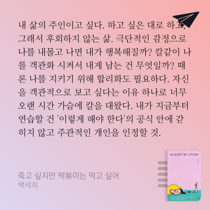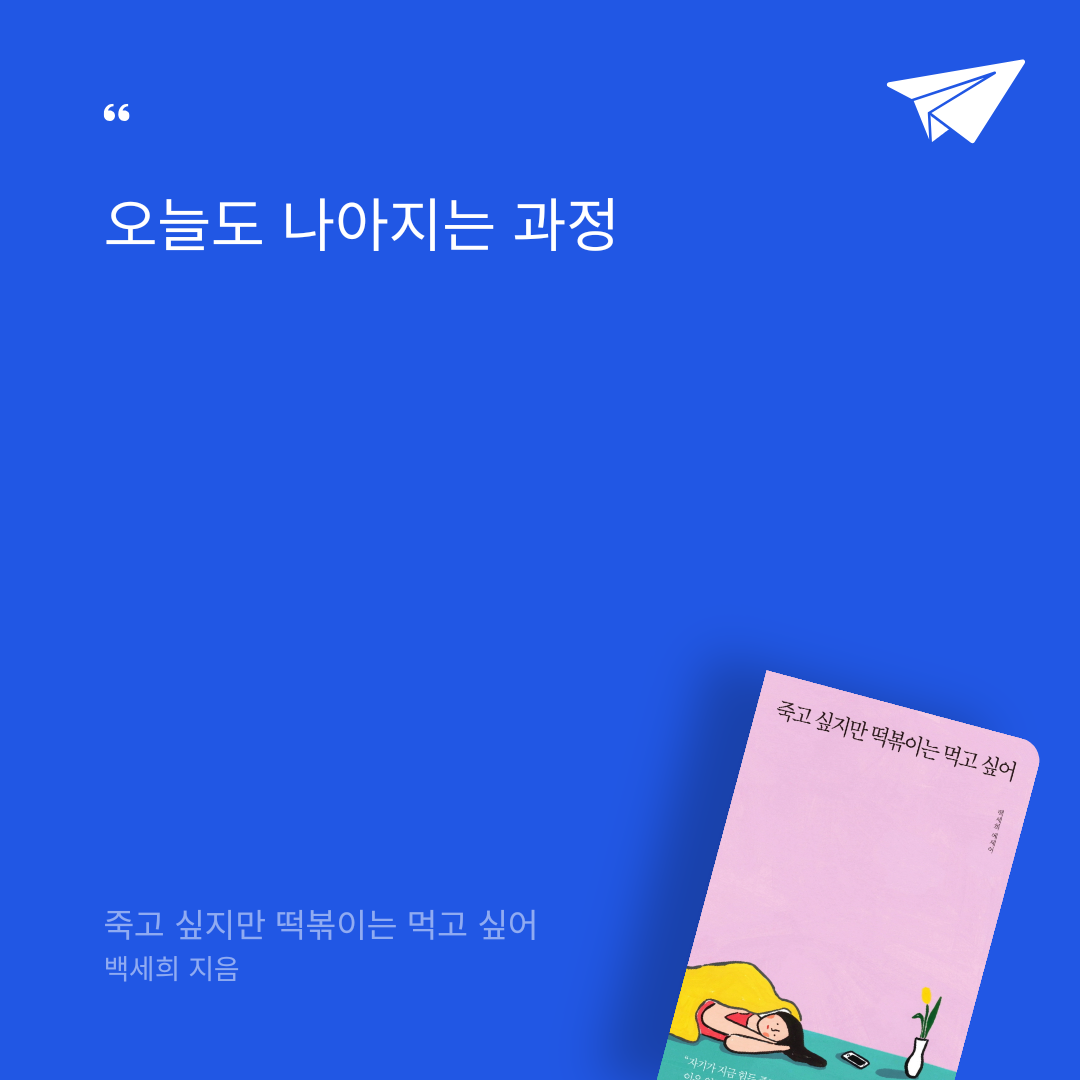 요약죽고 싶지만 떡볶이는 먹고 싶어는 백세희 작가가 2018년 흔출판사에서 펴낸 에세이로, 기분부전장애와 불안장애를 겪으며 정신과 상담을 받은 12주간의 기록을 담은 책이다. 🥣 텀블벅 펀딩을 통해 독립출판으로 시작해 전 세계 100만 부 판매와 25개국 출간, BTS RM의 추천으로 화제를 모은 이 작품은 저자의 내밀한 고백과 정신과 전문의와의 대화를 통해 우울과 불안의 실체를 솔직히 드러낸다. 전반부는 상담 녹취록, 후반부는 일기 형식으로 구성되어, 저자의