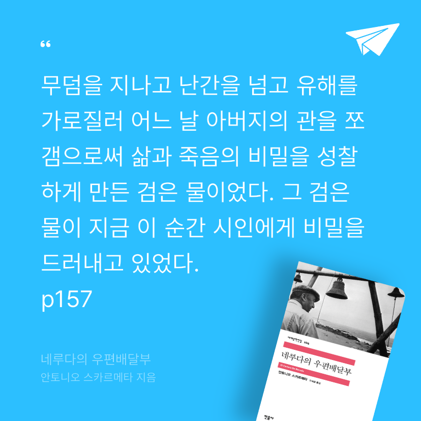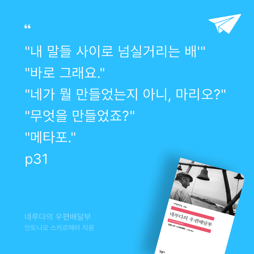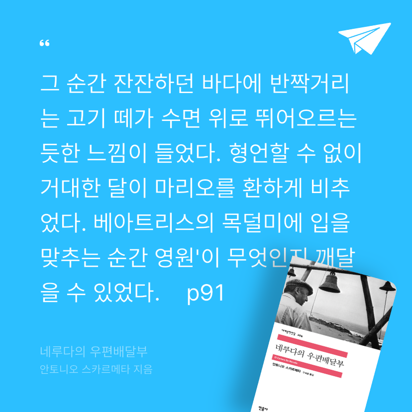 요약안토니오 스카르메타의 네루다의 우편배달부는 1960년대 말 칠레의 작은 어촌 마을 이슬라 네그라를 배경으로, 젊은 우편배달부 마리오 히메네스와 위대한 시인 파블로 네루다의 만남을 그린 소설이다. 📖 마리오는 열일곱 살의 평범한 청년으로, 어부 일을 싫어해 우편배달부로 취직한다. 그의 유일한 임무는 망명 중인 네루다에게 편지를 배달하는 것이다. 네루다는 노벨문학상을 수상한 칠레의 국민 시인으로, 정치적 망명 생활 중에도 시를 쓰며 조용히 지낸다. 마리오는 처음엔 네루다의 명성에 관심이 없었