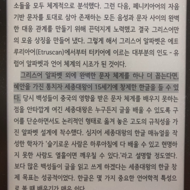 📖 이러한 전반적인 역사를 메타적 관점으로 살펴보면 인류 역사에서 지적 사고의 발달을 촉진한 원동력은 최초의 알파벳도 최고의 알파벳도 아닌, 바로 문자 그 자체다.