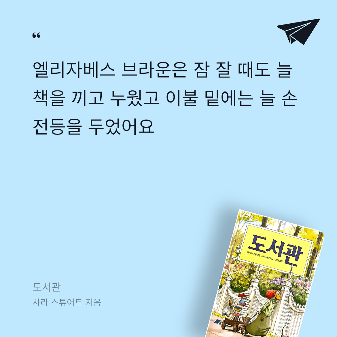 요약도서관은 책을 너무나 사랑하는 주인공 엘리자베스 브라운의 일생을 담은 아름답고 따뜻한 그림책입니다. 어린 시절부터 엘리자베스는 인형 놀이나 다른 아이들이 즐기는 놀이에는 도통 관심이 없었습니다. 그녀의 유일하고도 가장 큰 기쁨은 오직 책을 읽는 것이었습니다. 학교에서도, 집에서도, 심지어 식사 시간에도 그녀의 손에는 항상 책이 들려 있었습니다. 다른 사람들과 어울려 놀기보다는 조용한 구석에 앉아 활자 속의 세상으로 빠져드는 시간을 훨씬 소중하게 여겼습니다. 📚