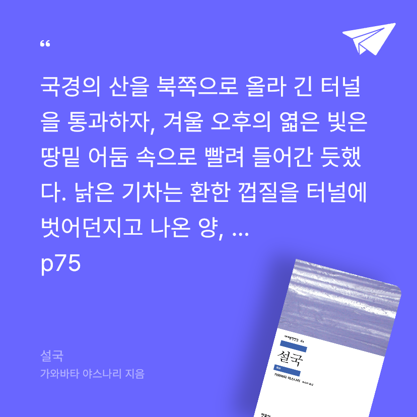일본 문학사상 최고의 서정 소설로 평가받는 <설국>이 정식 계약을 통해 출판되었다. 눈 쌓인 온천 마을, 설산, 내연 모를 아름다운 여인, 게이샤 등등 주요 장면이나 인물들의 이미지는 공감각적으로 독자의 감성을 건드린다.