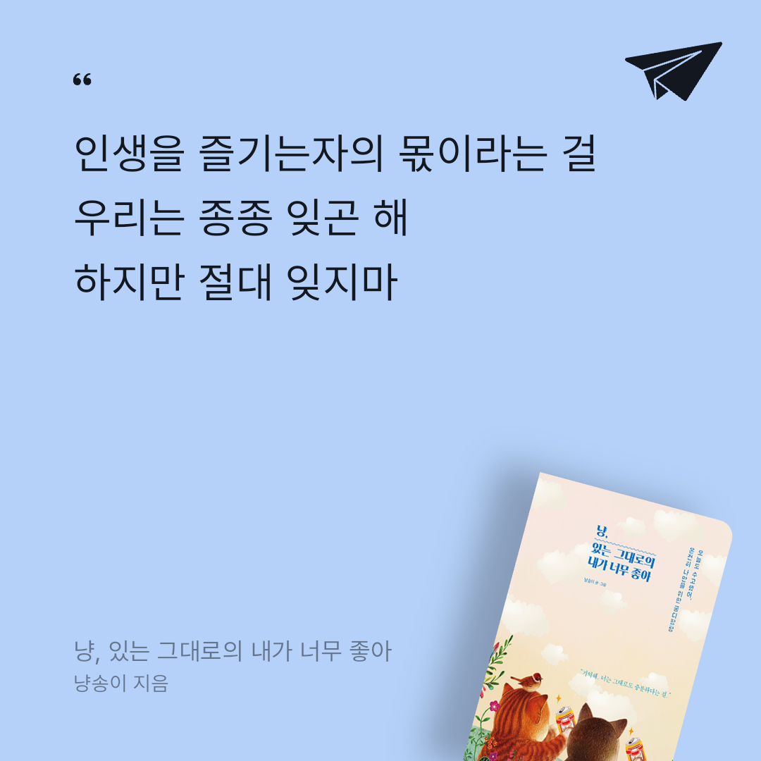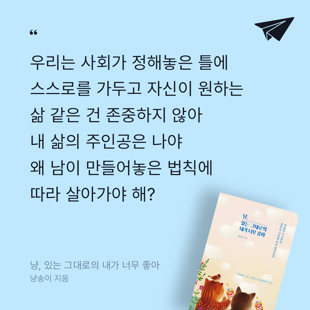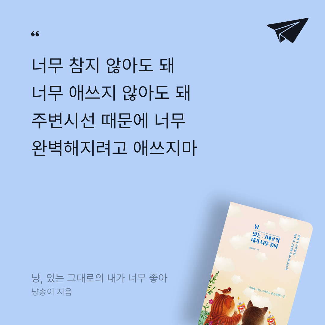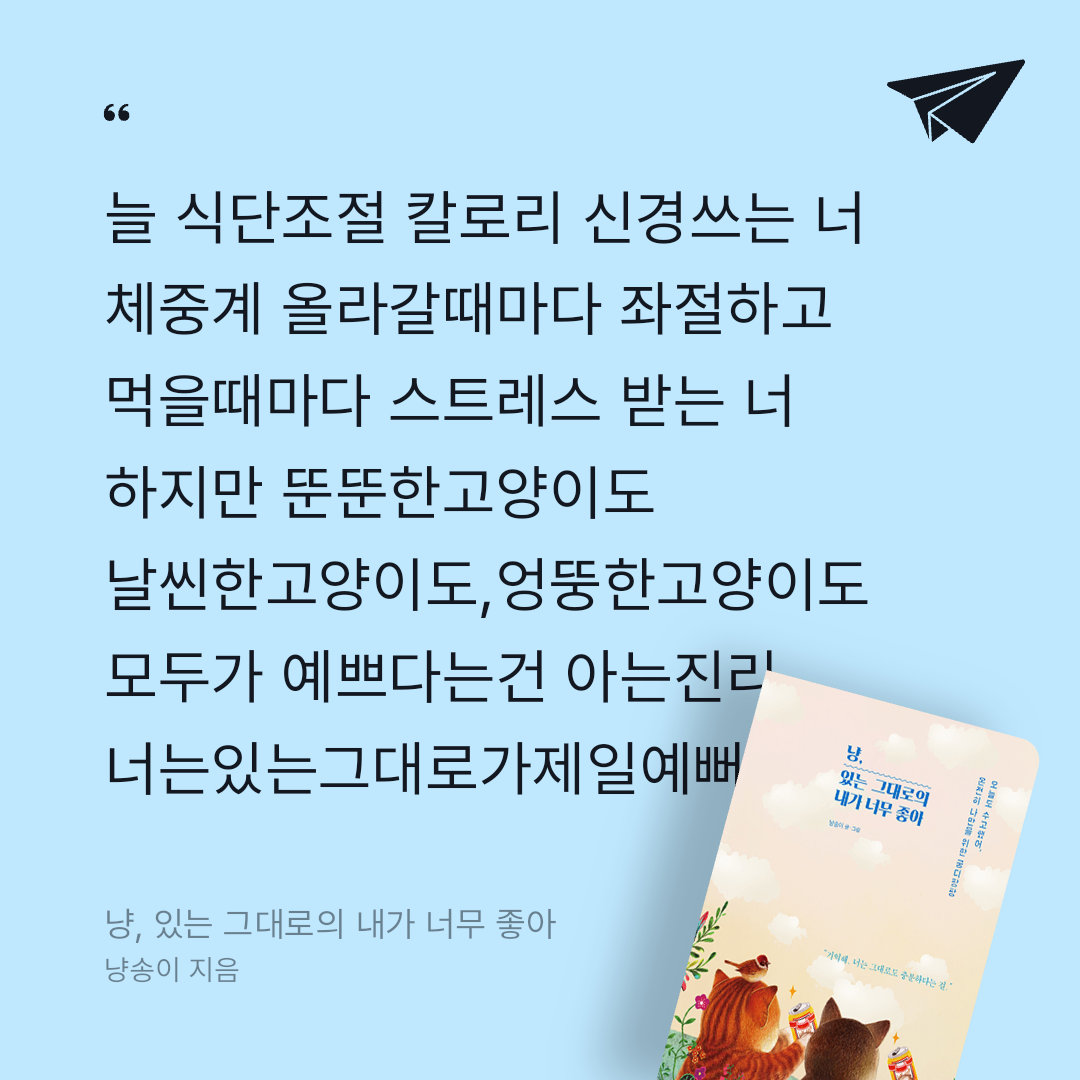 요약『냥, 있는 그대로의 내가 너무 좋아 (오늘도 수고했어, 온전히 나를 위한 궁디팡팡)』은 한국 작가 냥송이의 첫 에세이로, 2023년 10월 앵글북스에서 출간되었다. 📖 ISBN 9791187512301인 이 약 240페이지의 책은 인스타그램 15만 팔로워를 보유한 고양이 콘텐츠 크리에이터 냥송이가 고양이 ‘궁디팡팡’(길고양이 출신)과의 일상을 통해 자존감과 치유를 이야기한다. 냥송이는 길고양이 구조 활동과 SNS에서 공유한 따