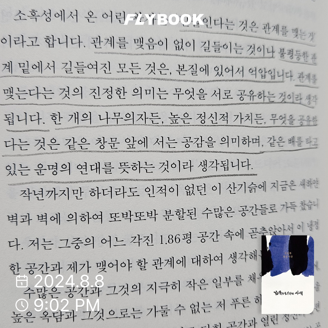요약《감옥으로부터의 사색》(ISBN: 9788971999110)은 신영복이 1988년 돌베개에서 초판을 출간한 옥중서간집으로, 2018년 증보판은 약 488쪽 분량이다. 서울대 경제학과를 졸업하고 육군사관학교 교관으로 재직 중이던 신영복은 1968년 통일혁명당 사건으로 무기징역을 선고받아 20년 20일간 남한산성, 안양, 대전, 전주 교도소에서 복역했다. 이 책은 1969년부터 1988년까지 가족과 지인에게 보낸 230여 편의 편지와 메모를 시기별로 정리한 것으로, 198