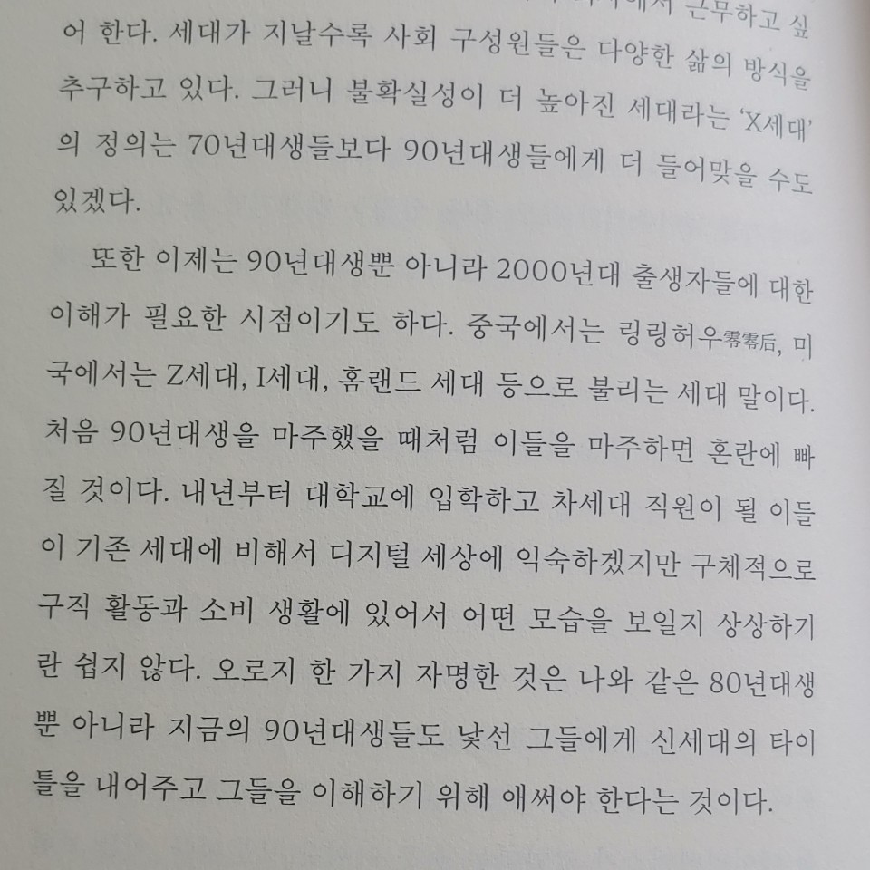 요약『90년생이 온다』는 임홍택 작가가 2018년에 웨일북에서 출간한 경제·경영서로, 1990년대생(이하 90년생)의 사고방식, 가치관, 소비 패턴을 분석하며 기성세대와의 공존 방안을 모색한다(ISBN: 9791188248674). 저자는 KAIST 경영대학에서 정보경영 석사 학위를 받고 CJ그룹에서 12년간 신입사원 교육과 마케팅 업무를 담당한 경험을 바탕으로, 90년생의 독특한 특성을 ‘간단함, 병맛, 솔직함’으로 정의한다. 이 책은 드루킹 사건, 세월호 음모론 등 실제 사례와 통계, 인터뷰를 활