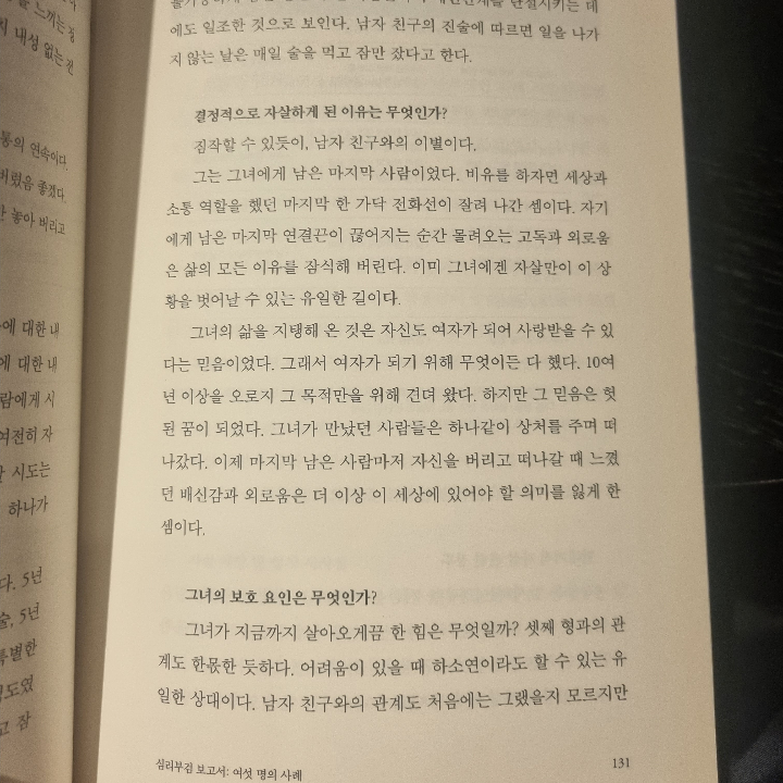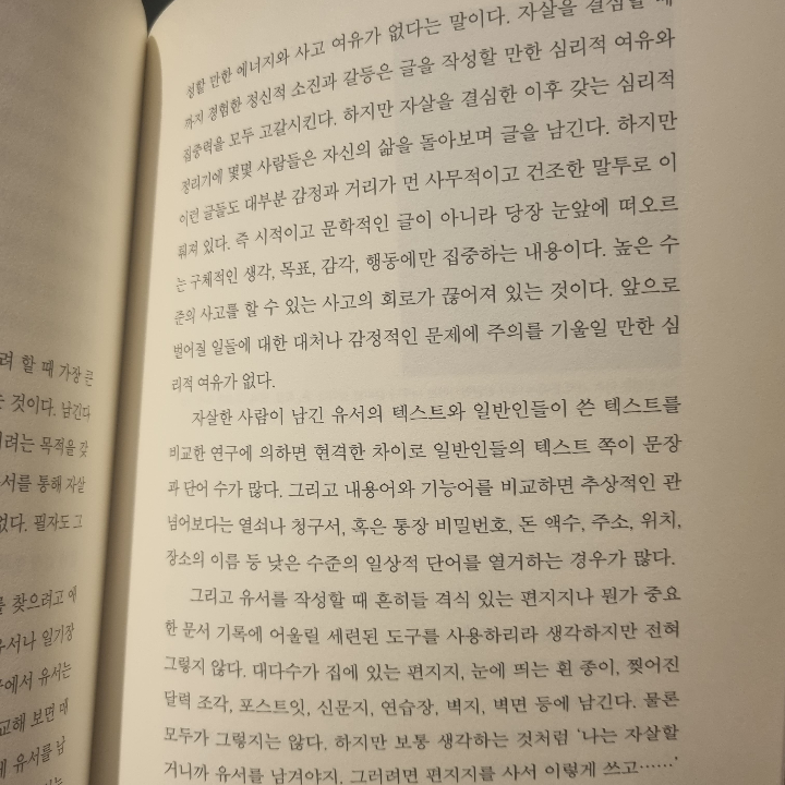 요약《심리부검 (나는 자살한 것을 후회한다)》은 서종한 박사가 2016년에 출간한 책으로, 자살이라는 비극을 심리부검이라는 과학적 접근법을 통해 이해하고 예방 방안을 모색한 작품이다. 🌟 저자는 국내 심리부검의 선구자로, 중앙심리부검센터에서 자살 사망자의 유가족과 주변인을 인터뷰하며 그들의 심리적 흔적을 분석한 경험을 바탕으로 이 책을 썼다. 심리부검은 사망 후 유가족과 주변인의 증언을 통해 자살자의 심리 상태와 동기를 추적하는 방법으로, 단순히 통계나 추측에 의존하지 않고
