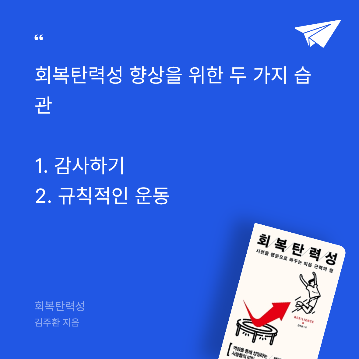 요약《회복탄력성》은 김주환 교수가 역경을 딛고 다시 일어서는 인간 내면의 힘을 탐구한 책으로, 심리학, 뇌과학, 철학을 아우르며 회복탄력성의 본질과 이를 키우는 방법을 제시한다. 🌱 저자는 회복탄력성을 ‘시련을 행운으로 바꾸는 마음의 근력’으로 정의하며, 이를 통해 삶의 크고 작은 도전을 극복할 수 있다고 강조한다. 책은 사례, 연구, 실천법을 체계적으로 정리해 독자가 자신의 내면을 돌아보고 성장하도록 돕는다.