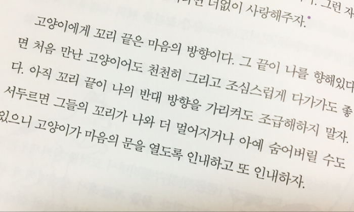 나응식 수의사가 각종 일화를 통해 설명하는 고양이의 감정 표현을 쉽고 재미있게 익힐 수 있는 책이다. 그 외 발톱 깎는 방법, 목욕법, 화장실 관리까지 고양이와 함께 행복해지고 싶은 집사라면 꼭 알아야 할 지식이 한데 모여있다.