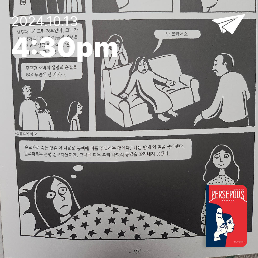 요약페르세폴리스는 이란계 프랑스인 마르잔 사트라피(Marjane Satrapi)의 자전적 그래픽노블로, 2000년 프랑스에서 처음 출간된 이후 전 세계적으로 큰 반향을 일으킨 작품이다. 이 책은 1979년 이슬람 혁명과 이란-이라크 전쟁이라는 격동의 시대를 배경으로, 사트라피의 어린 시절부터 20대 초반까지의 성장기를 담고 있다. 2019년 휴머니스트에서 출간된 완전판은 기존 한국어판 1~2권을 합본한 것으로, 새로운 번역과 견고한 제본, 큰 판형(165×245mm)으로 원서의 디테일을 살렸다.