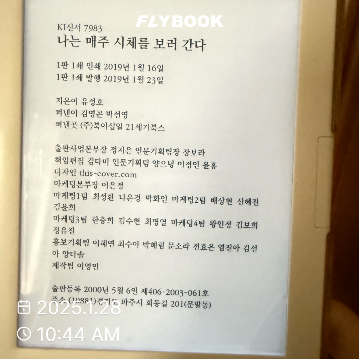 요약『나는 매주 시체를 보러 간다 (서울대학교 최고의 ‘죽음’ 강의)』는 유성호 서울대학교 의과대학 법의학교실 교수가 2019년 21세기북스에서 출간한 인문 교양서로, ISBN 9788950979409를 가진다. 📘 20년간 1,500건 이상의 부검을 담당한 법의학자이자 SBS <그것이 알고 싶다> 자문 전문가인 저자는, 2013년 개설한 서울대 교양강의 ‘죽음의 과학적 이해’를 바탕으로 이 책을 썼다. 60명 정원으로 시작해 210명 대형 강의로 성