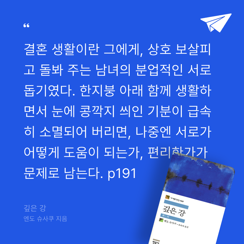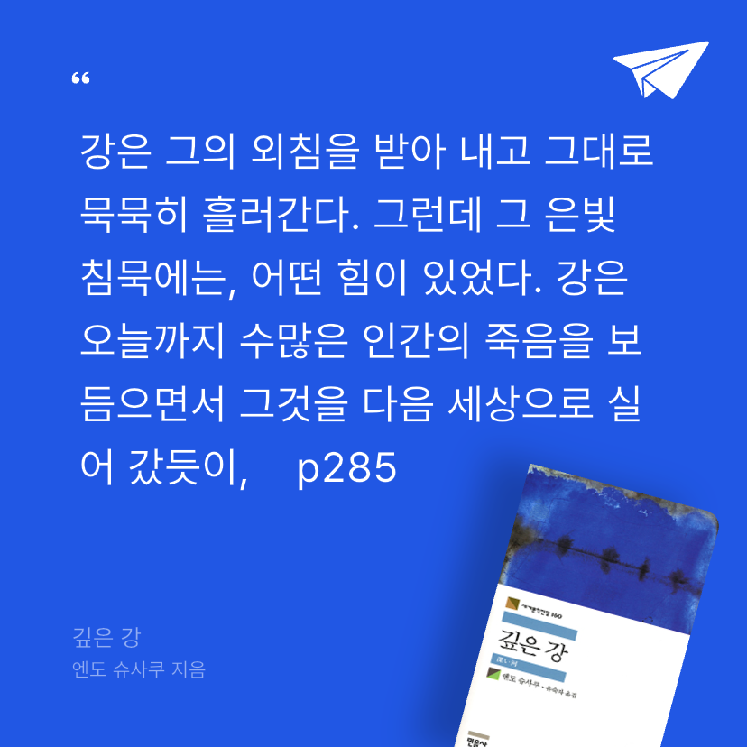 국내에는 <침묵>의 작가로 잘 알려진, 평생에 걸쳐 신과 구원의 문제에 천착한 엔도 슈사쿠는, 1993년 병마와 사투를 벌이며 완성한 마지막 장편소설 <깊은 강>에 자기 문학의 모든 주제를 집약해 놓았다. 신은 인간 내면에 살아 숨 쉬며, 인간을 속박하는 것이 아니라 포용하는 존재임을 이 소설을 통해 역설한다.