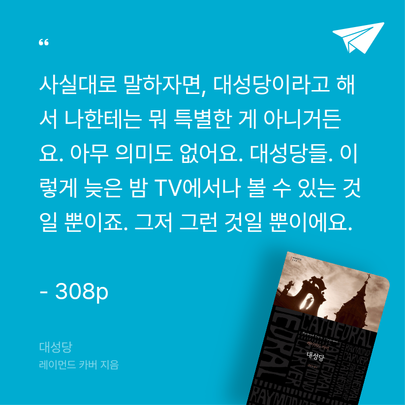 요약『대성당』(문학동네, 2014)은 미국 작가 레이먼드 카버의 대표적인 단편소설집으로, 그의 후기 작품들을 모은 1983년작이다. 📖 12편의 단편소설은 미국 중산층과 노동계층의 일상 속 고독, 소외, 그리고 인간관계의 미묘한 균열을 간결하고 절제된 문체로 그린다. 카버의 “미니멀리즘”은 불필요한 묘사를 배제하고, 대화와 행동을 통해 인물의 내면을 드러내며, 독자로 하여금 행간의 감정을 읽게 한다. 이 소설집은 카버의 전기 작품보다 따뜻한 시선과 희망의 가능성을 담아 그의 문학적 전
