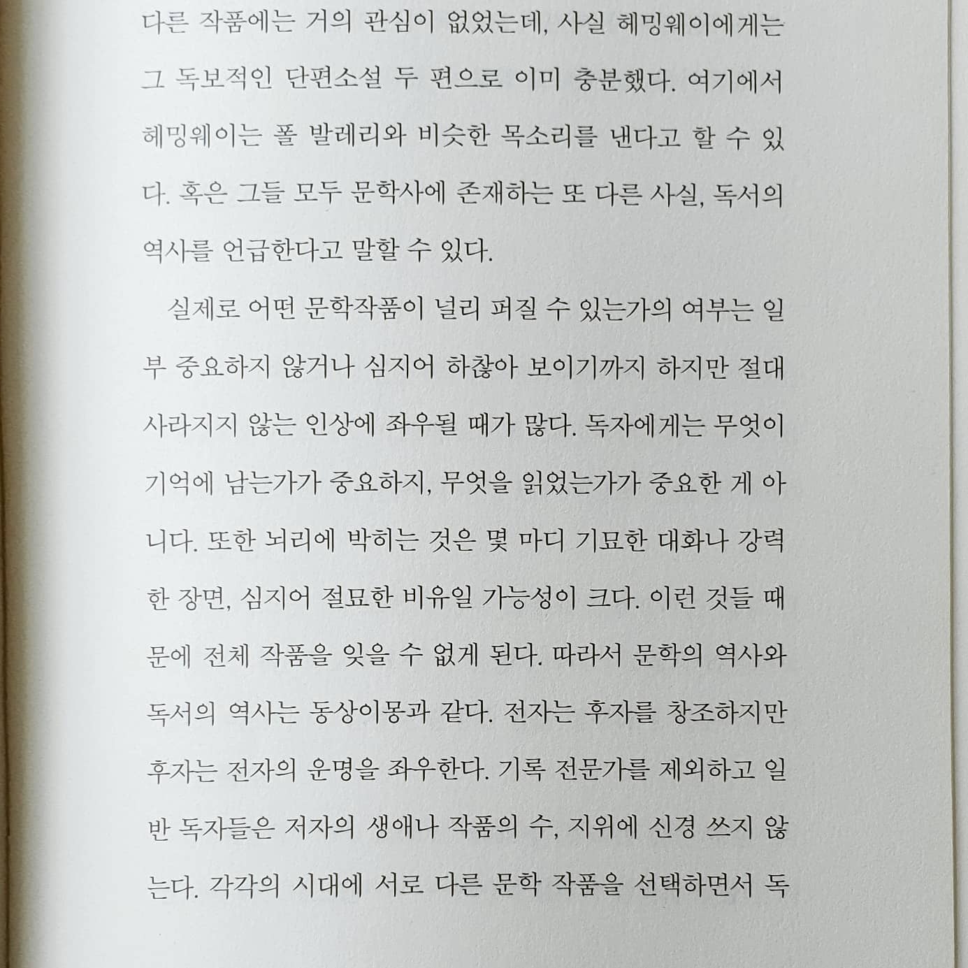 독자에게는 무엇이 기억에 남는가가 중요하지, 무엇을 읽었는가가 중요한 게 아니다. 또한 뇌리에 박히는 것은 몇 마디 기묘한 대화나 강력한 장면, 심지어 절묘한 비유일 가능성이 크다. 이런 것들 때문에 전체 작품을 잊을 수 없게 된다. 따라서 문학의 역사와 독서의 역사는 동상이몽과 같다.