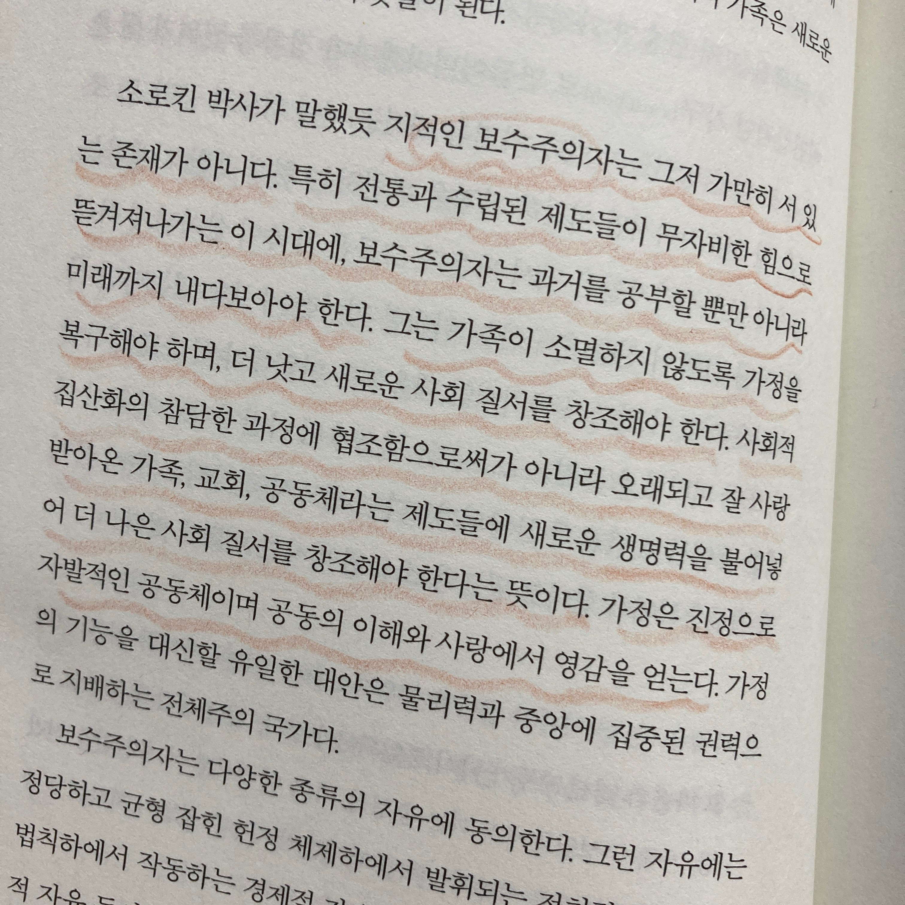 -근대사회는 진정한 공동체를 시급히 필요로한다. 진정한 공동체는 집산주의(공산/사회주의)와 완전히 별개의 존재다. 이는 강제가 아닌 사랑과 자선으로 다스려진다. 교회, 자발적모임,지역정부,다양한 기관들을 통해 보수주의자들은 건강한 공동체를 유지하려한다