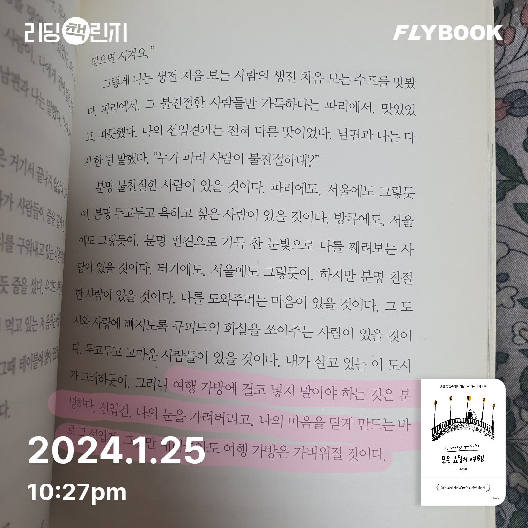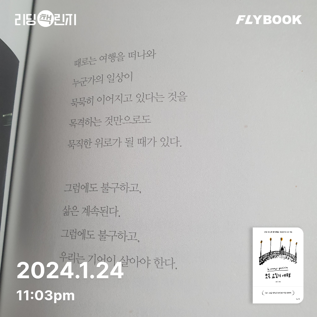 요약김민철의 모든 요일의 여행은 카피라이터로서의 일상을 넘어 여행자로서의 내면을 기록한 에세이다. 📖 2016년 북라이프에서 출간된 이 책은 저자가 전작 모든 요일의 기록에서 보여준 일상 속 시각을 낯선 공간으로 확장하며, 여행을 통해 자신을 찾아가는 과정을 담았다. 김민철은 TBWA KOREA의 크리에이티브 디렉터로, SK텔레콤 ‘사람을 향합니다’, 네이버 ‘세상의 모든 지식’ 같은 캠페인을 만든 인물이다. 그녀는 기억력이 약해 기록에 의존하는 습관을 살려, 여행지에서의 순간을 섬세하게
