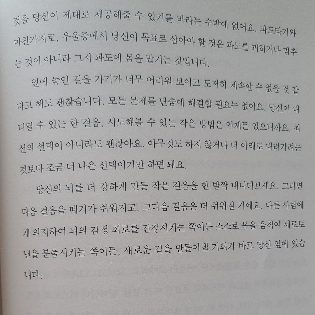 요약이 책은 신경과학적 관점에서 우울증이 단순히 마음의 문제가 아니라 뇌 속의 회로와 신경전달물질의 상호작용으로 인해 발생하는 일종의 ‘하향식 나선(downward spiral)’임을 밝히며 시작합니다. 저자인 앨릭스 코브는 뇌가 우울이라는 부정적인 루프에 빠졌을 때, 이를 어떻게 다시 긍정적인 방향으로 돌려놓을 수 있는지 구체적인 실천 전략을 제시합니다. 그는 뇌를 거대한 기계가 아니라 여러 시스템이 연결된 네트워크로 설명하