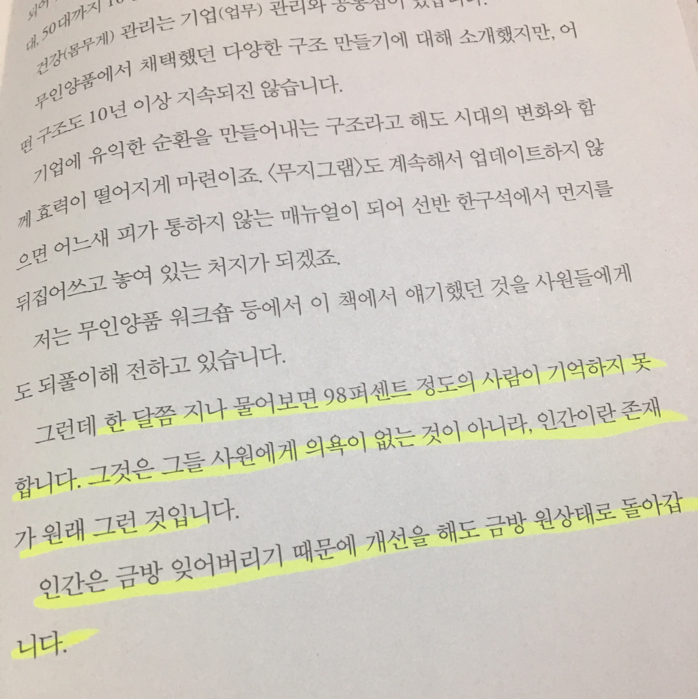 무인양품의 본사인 양품계획 회장 마쓰이 타다미쓰가 무인양품의 경영 비밀을 직접 밝힌 최초의 책. 그가 사장에 취임한 2001년부터 지금까지 조직의 구조와 풍토를 바꾸면서 어떻게 성장해왔는지 소개한다.