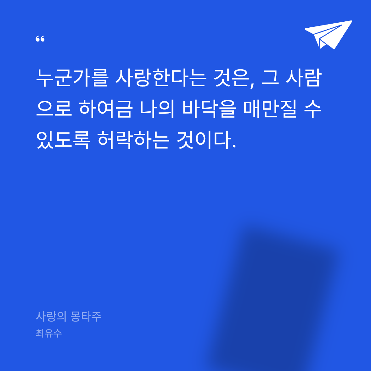 요약사랑의 몽타주는 최유수 작가가 2015년 도어스프레스에서 출간한 에세이로, 독립출판계에서 큰 반향을 일으키며 베스트셀러로 자리 잡은 작품이다. 📖 2017년 디자인이음의 ‘청춘문고’ 시리즈로 리커버판이 출간되며 더 많은 독자에게 사랑받았다. 최유수는 미디어아트를 전공하고, 통의동에서 도어스프레스를 운영하며, 사랑과 이별, 삶의 단상을 시적이고 감미로운 문체로 풀어낸다. 이 책은 사랑이 남긴 흔적을 ‘몽타주’라는 영화적 기법에 비유해, 단편적인 감정 조각들을 모아 하나의 그림으로 완성한다. 10