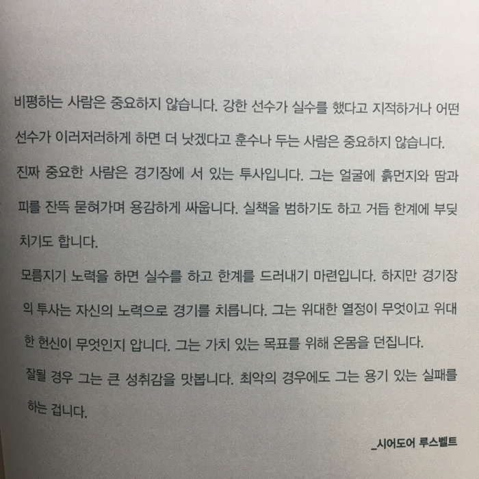 나를 사랑하는 사람들, 내가 의지하는 사람들은 넘어지더라도 관중석에서 손가락질하며 비난하지 않는다. 그 사람들은 경기장에서 나와 함께 싸우고 나를 위해 싸운다.