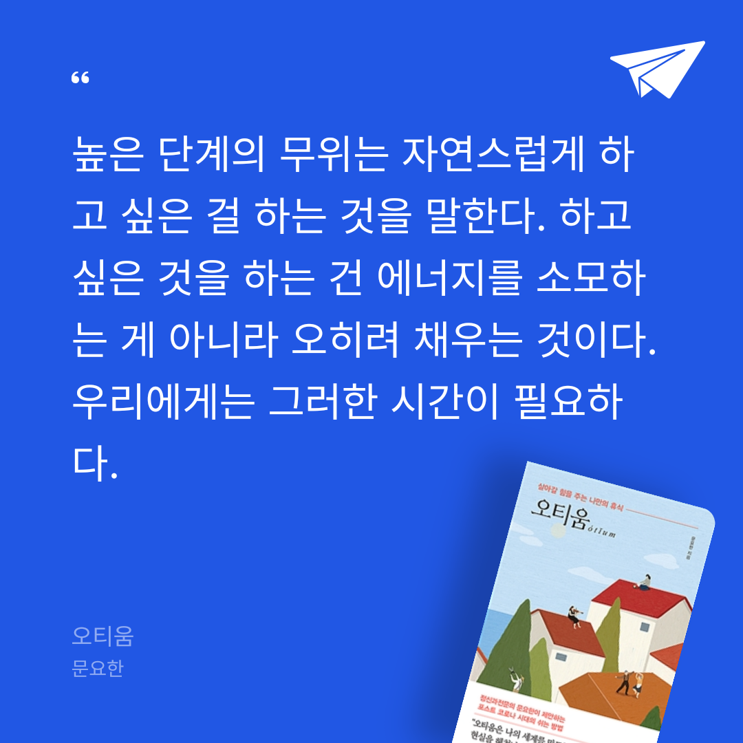 요약『오티움 (살아갈 힘을 주는 나만의 휴식)』은 정신과 전문의 문요한이 현대인의 휴식과 삶의 기쁨을 탐구한 에세이로, 단순한 쉼을 넘어 삶에 활력을 불어넣는 ‘능동적 여가’의 중요성을 강조한다. 🌿 저자는 코로나19로 인해 갑작스럽게 늘어난 여가 시간이 많은 이들에게 ‘코로나 블루’를 안겼다고 진단하며, 단순히 시간을 때우는 휴식이 아니라 삶을 충만하게 만드는 ‘오티움’의 필요성을 제안한다. 오티움은 라틴어로 여가를 뜻하며, 저자는 이를 결과에 상관없이 활동 자체로 기쁨을