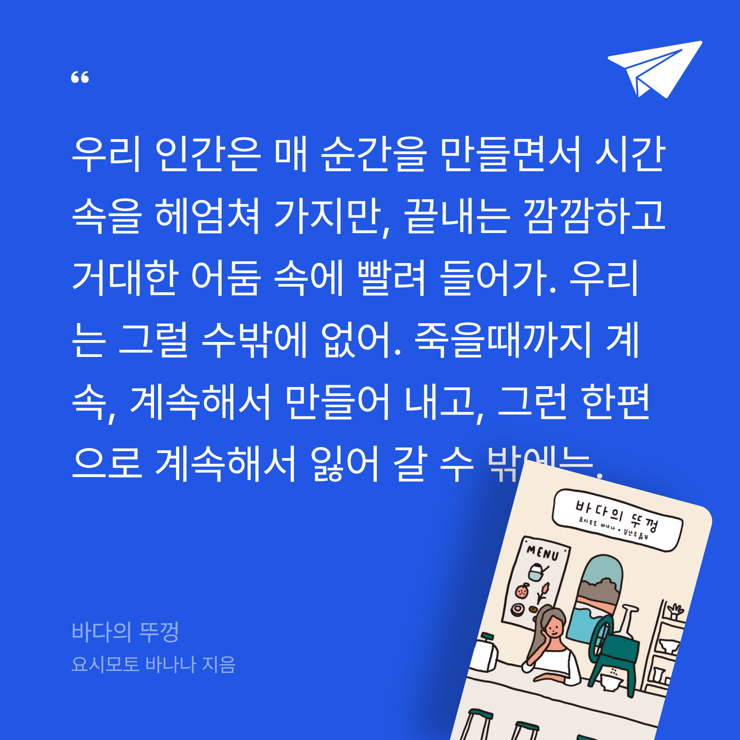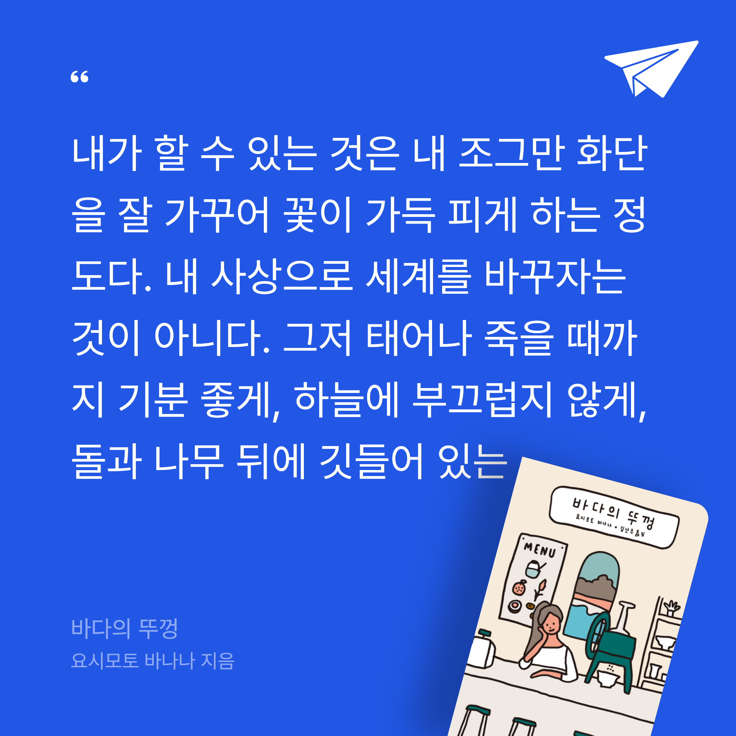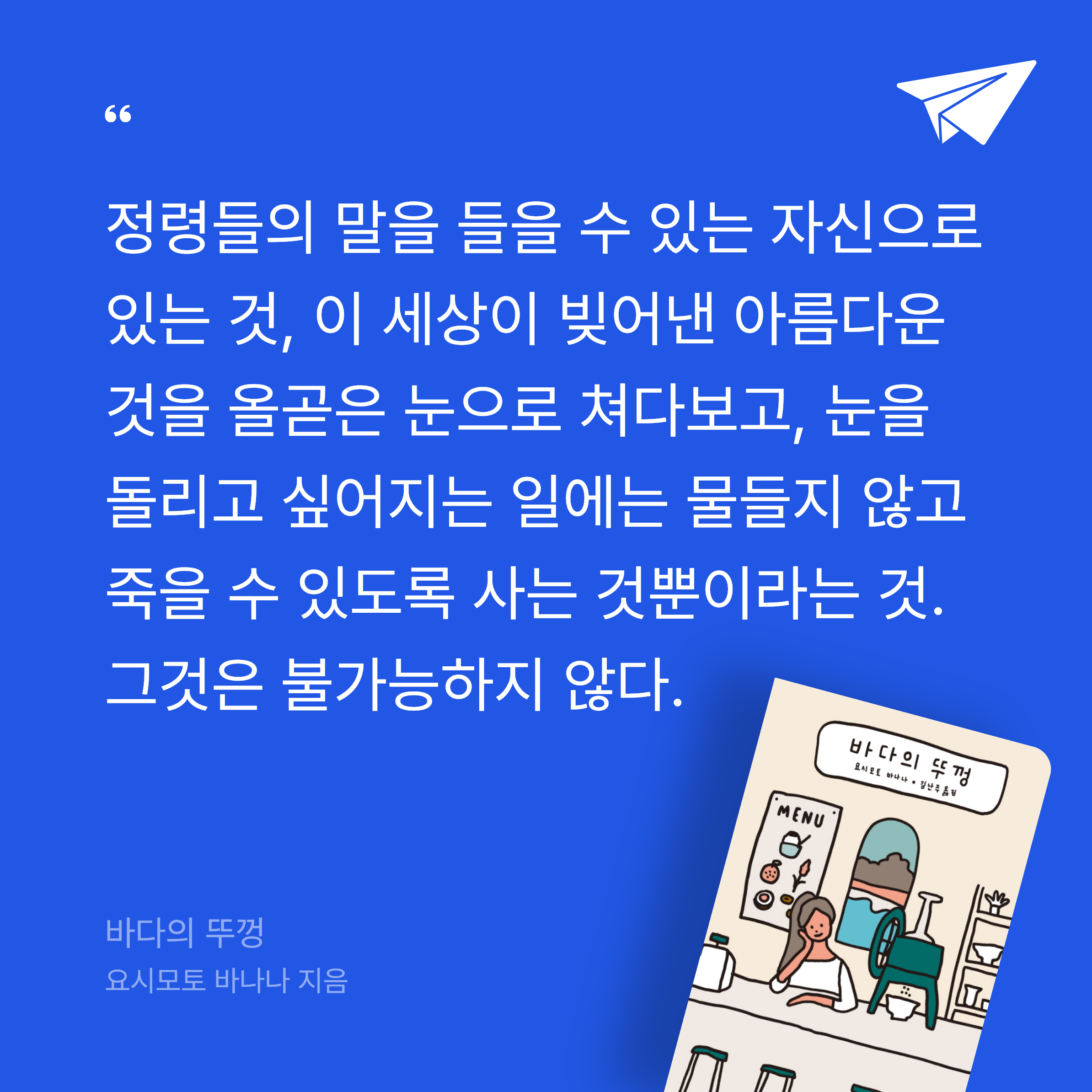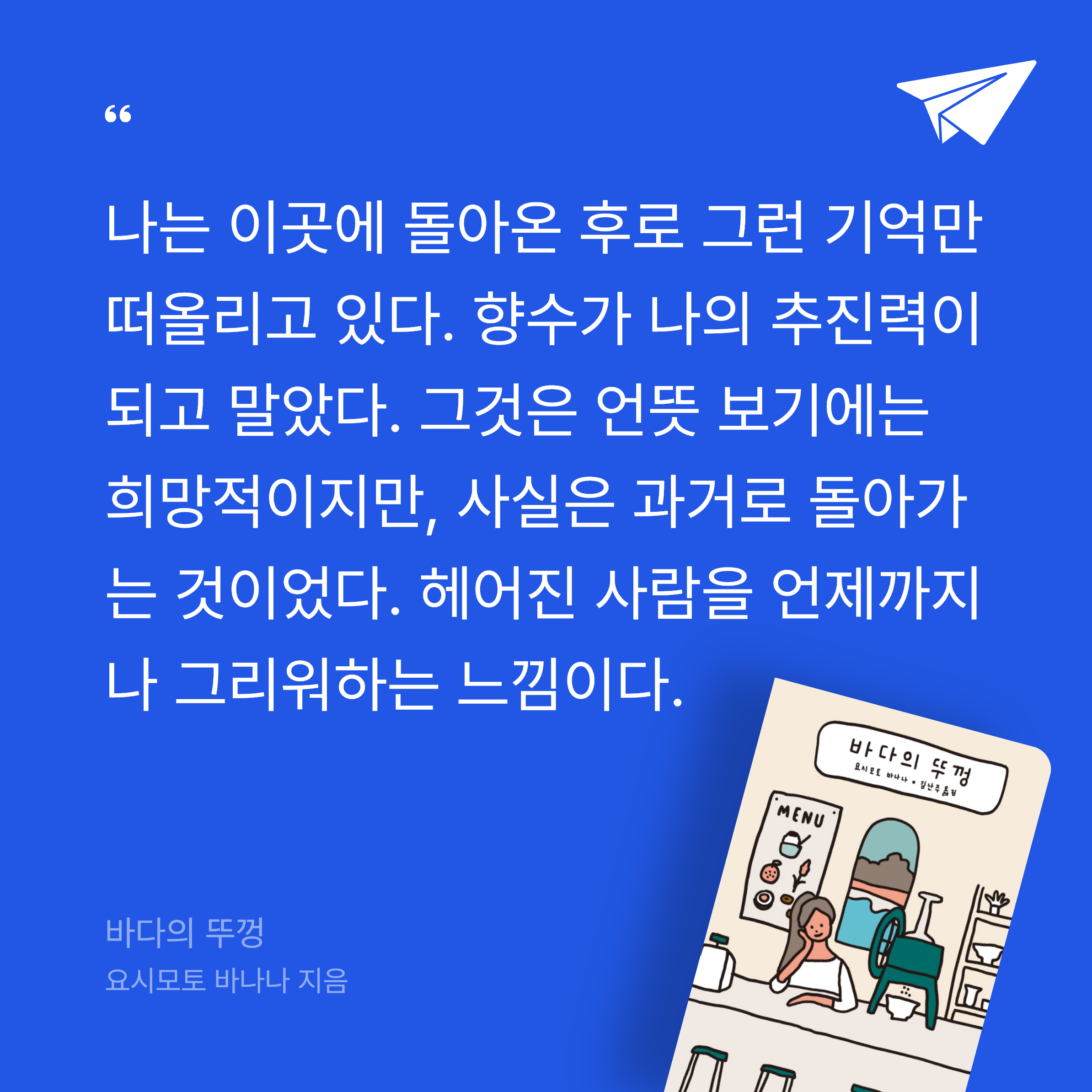 요약요시모토 바나나의 바다의 뚜껑은 일본의 한적한 해변 마을을 배경으로, 두 젊은 여성의 우정과 치유를 그린 장편소설이다. 📖 주인공 마리는 도쿄에서 미술을 전공한 후, 복잡한 도시 생활에 지쳐 고향으로 돌아온다. 그녀는 해변 근처 솔숲에 조그만 빙수 가게를 열고, 사탕수수, 감귤, 패션프루트, 단팥 네 가지 맛의 빙수를 만든다. 이 가게는 단순한 상점이 아니라, 마리에게 새로운 삶의 시작을 상징한다. 어느 날, 마리의 어머니 친구 딸 하지메가 가게를 찾아온다. 하지메는 얼굴과 어깨에 화상 흉터가