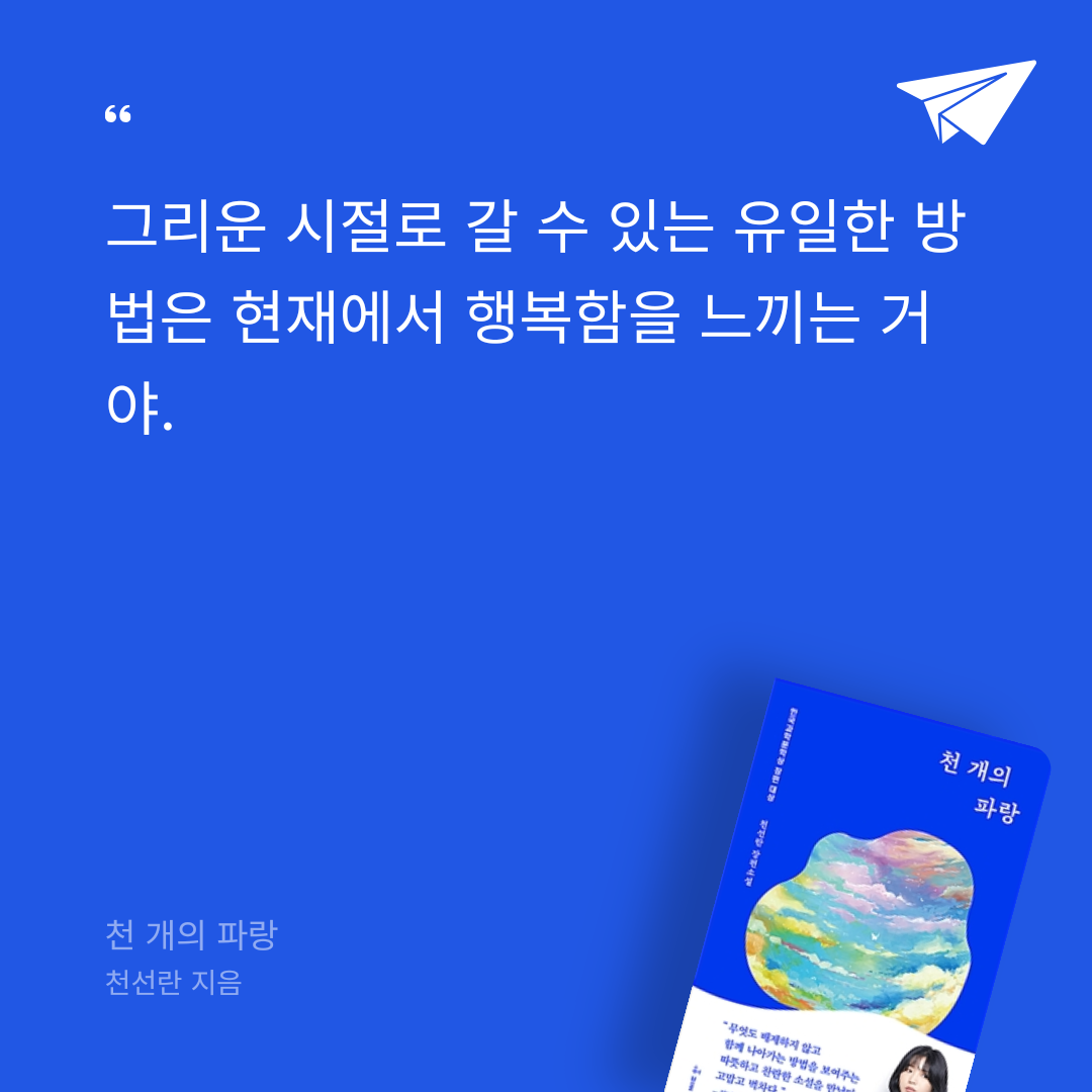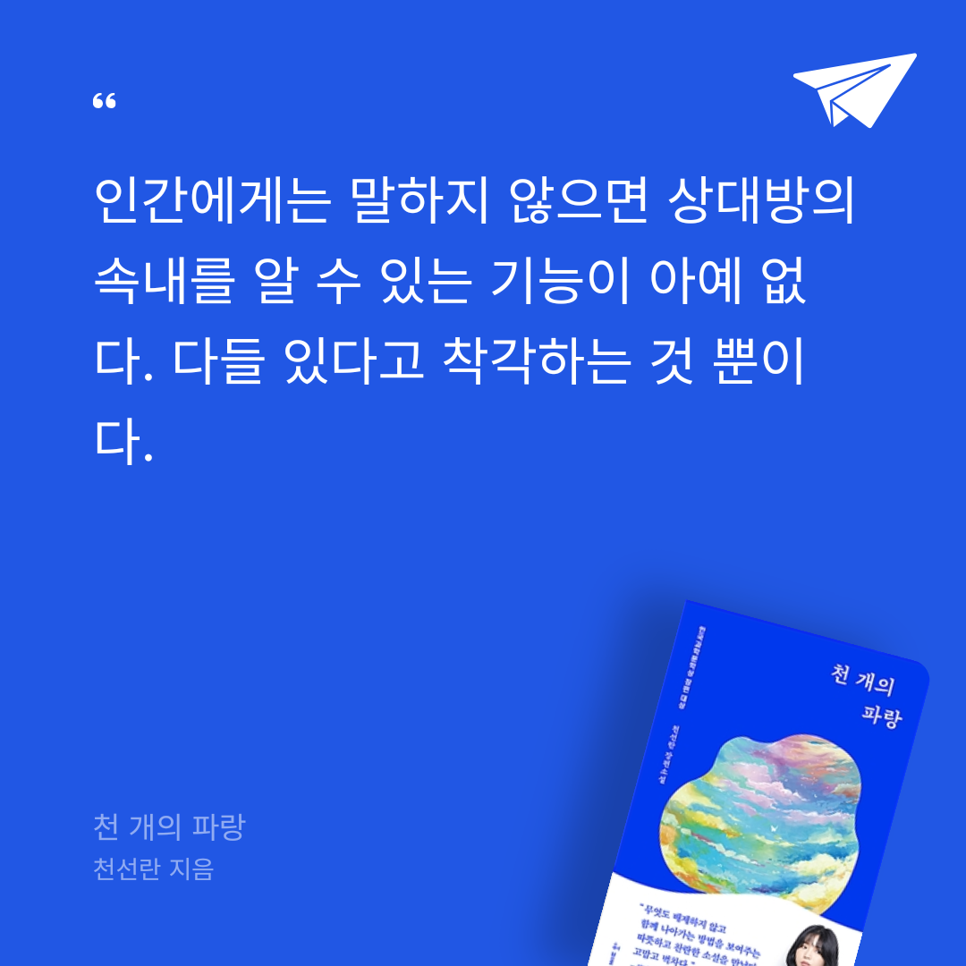 요약천 개의 파랑은 천선란 작가가 2019년 제4회 한국과학문학상 장편소설 부문 대상을 수상한 SF 소설로, 2035년 휴머노이드가 일상화된 근미래를 배경으로 따뜻하고 감성적인 이야기를 그린다. 📖 이야기는 경마장 기수 휴머노이드 C-27, 일명 콜리와 로봇에 열정을 가진 소녀 연재, 그리고 연골이 닳아 더 이상 달릴 수 없는 말 투데이를 중심으로 전개된다. 콜리는 제작 과정에서 실수로 학습용 인지 칩이 삽입되어 감정과 사고를 가진