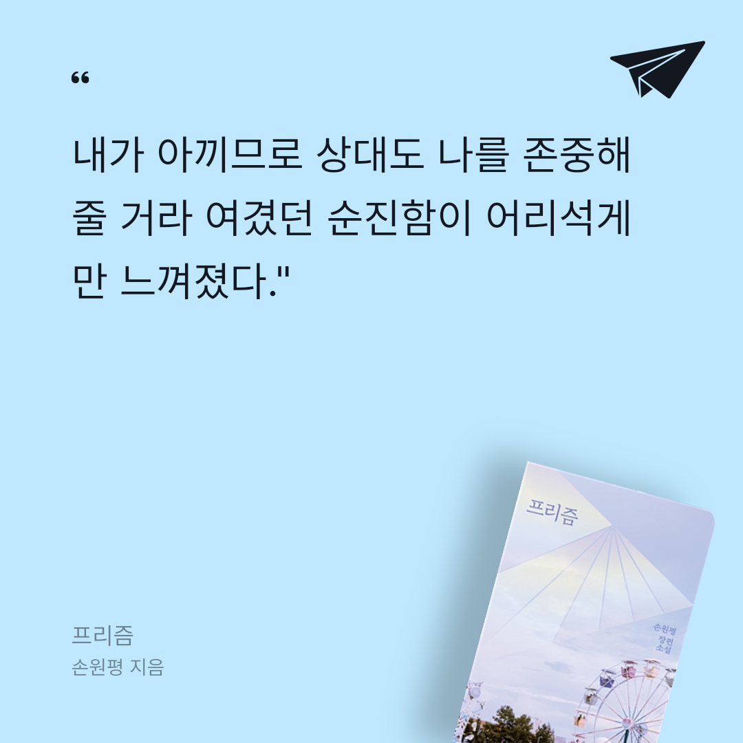 타인의 몰이해와 공감하지 못하는 현실을 매력적이고 특유의 감각적인 문체로 그려내는 작가 손원평. 이번 신작 장편소설 <프리즘>은 네 남녀의 사랑에 대해, 만남과 이별의 과정에서의 여러 갈래로 흩어지는 ‘마음’을 다양한 빛깔로 비추어가는 이야기이다.
