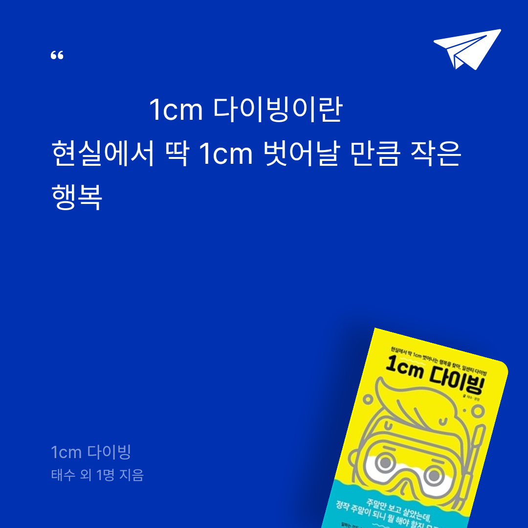 요약『1cm 다이빙』은 태수와 문정이 2020년 1월 FIKA(피카)에서 출간한 에세이로, ISBN 9791190299060을 통해 기록되었다. 📖 약 248페이지 분량의 이 작품은 YES24 리뷰 총점 9.1(3,000건 이상)을 기록하며, “현실에서 1cm 벗어나는 소소한 행복을 찾는 감동적 에세이”로 평가받는다. 2020년 에세이 베스트셀러 1위, 20만 부 판매, 일본·대만 등 5개국 수출, 텀블벅 펀딩 1,000% 달성이라는 기록을 세웠다. 태수는 서른 살 예비신랑이자 삼십 대 후반의 프리랜