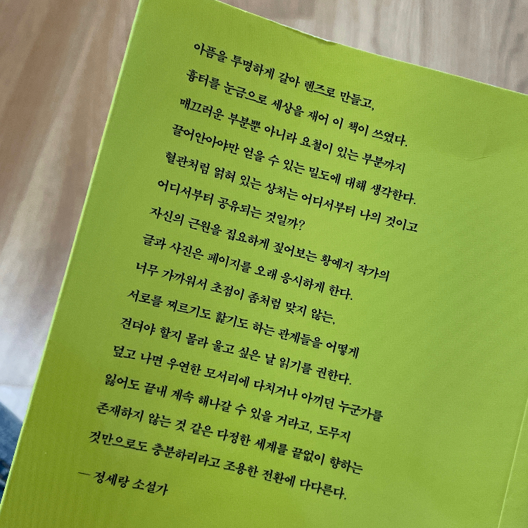 요약《다정한 세계가 있는 것처럼》은 젊은 사진가 황예지가 가족과 개인의 아픔을 사진과 글로 기록하며 치유와 화해를 탐구한 에세이집이다. 2020년 바다출판사에서 출간된 이 책은, 고등학교와 대학교에서 사진을 전공한 황예지가 졸업 작품 「절기」로 주목받으며 시작한 작업의 연장선에 있다. 10년 전 집을 떠난 엄마와 그 빈자리를 채운 언니를 렌즈에 담으며, 부서진 가족 관계와 복합적인 감정을 직시한다. 22편의 글로 구성된 이 책은 사랑과 증오, 연민과 분노가 얽힌 가족 서사를 통해, 슬