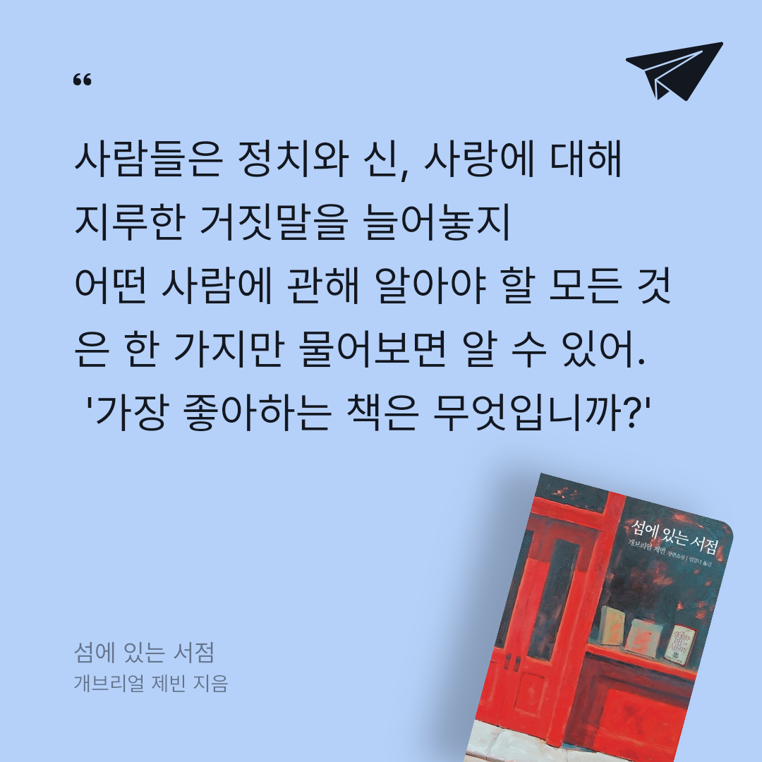 그러나 이 소설의 주인공이 ‘서점’이라는 설정이 마지막 장에서 드러난다. 섬에 있는 서점은 에이제이의 죽음 이후에 램비에이스와 이즈메이가 운영을 하게 된다. 램비에이스의 서점은 에이제이와는 다른 취향의 서점으로 운영될 것이다. 어말리아와 마야는 그들의 삶을 또 꾸려나가게 될 것이다. 흔히 예상되는 결말이 아니었으며 서점이라는 공간을 통해서 변화되는 사람들의 삶의 이야기가 흥미진진하게 펼쳐졌다. 열린 결말로 맺는다. 또 다른 에이제와 어말리아의 이야기가 펼쳐질 것 같은 그런 여유가 느껴졌다.