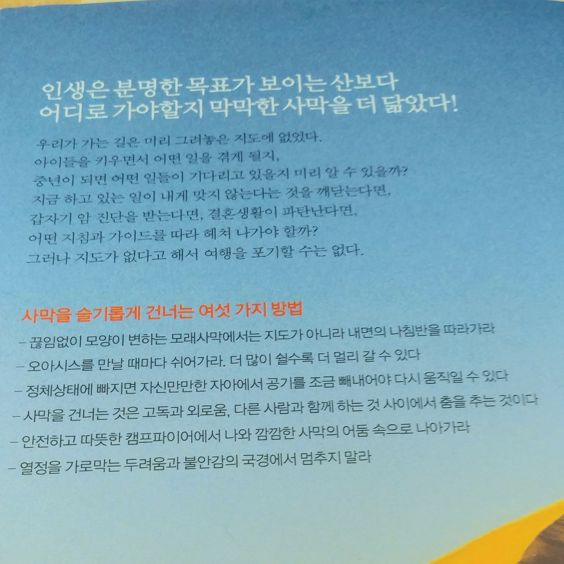 요약스티브 도나휴의 저서인 이 책은 인생을 예측 불가능한 사막을 횡단하는 과정에 비유하며, 우리가 삶이라는 길 위에서 마주하는 혼란과 막막함을 어떻게 헤쳐 나가야 하는지에 대한 지혜를 담고 있습니다. 저자는 사하라 사막을 횡단했던 자신의 경험을 바탕으로, 인생의 여정은 직선으로 뻗은 고속도로가 아니라 언제 어디서 모래 폭풍이 불어올지 모르는 험난한 사막과 같다는 점을 강조합니다.