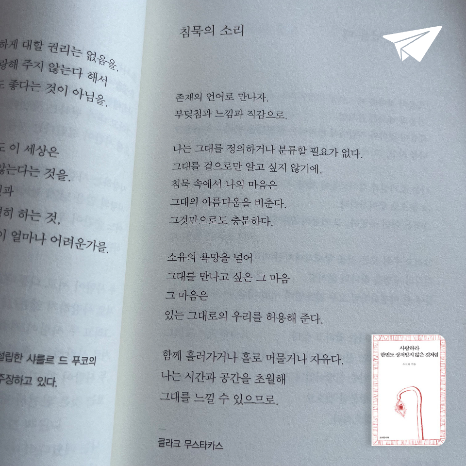 요약『사랑하라 한번도 상처받지 않은 것처럼』은 시인 류시화가 엮은 시집으로, 삶의 상처를 치유하고 사랑과 깨달음을 전하는 77편의 시를 담고 있다. 📖 이 책은 고대 이집트 파피루스 시부터 현대 노벨문학상 수상자의 작품까지, 41세기에 걸친 시들을 모아 완성되었다. 류시화는 이전 시집 『지금 알고 있는 걸 그때도 알았더라면』 이후 8년간 시를 수집하며, 인간의 깊은 감정을 어루만질 수 있는 작품들을 골랐다. 그는 시를 “추위 속에서 몸을 녹이는 불”이자 “길 잃은 이를 이끄는