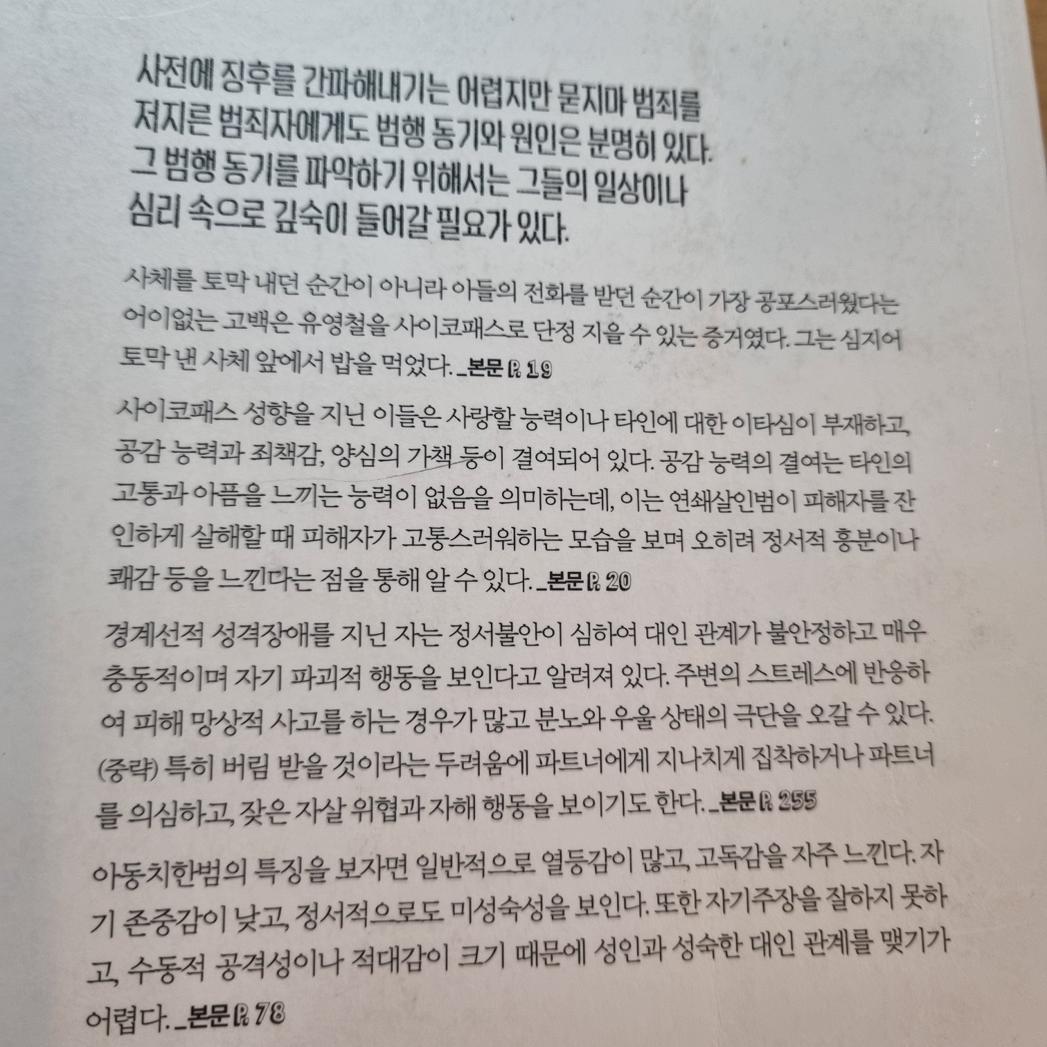 요약이수정과 김경옥의 사이코패스는 일상의 그늘에 숨어 지낸다는 2016년 중앙M&B에서 출간된 책으로, 범죄심리학자와 프로파일러의 시각에서 한국 사회를 뒤흔든 강력 범죄의 심리적 동기를 분석한 작품이다. 📖 이 책은 두 저자가 지난 10년간 직접 대면 조사한 범죄자들의 심리를 바탕으로, 사이코패스와 소시오패스의 특성, 그리고 그들이 일상 속에서 어떻게 숨겨져 있는지를 탐구한다. 저자들은 “왜 악마가 되었는가”라는