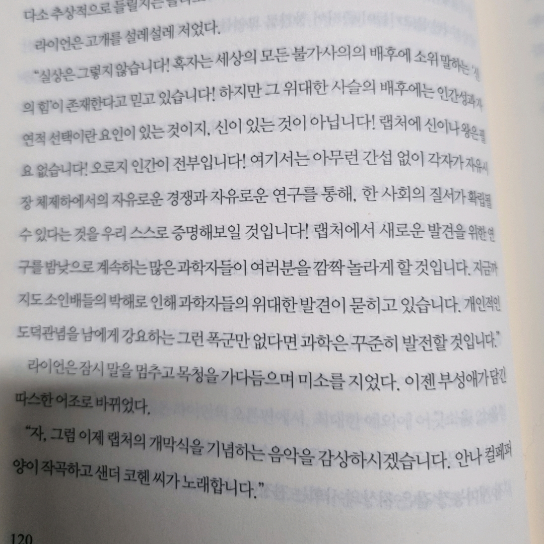요약바이오쇼크 게임 시리즈의 프리퀄 소설로, 수중 도시 랩처의 건설과 몰락을 통해 인간 욕망의 어두운 면을 탐구한다.🌊 1945년, 억만장자 앤드류 라이언은 히로시마와 나가사키 핵폭탄 투하를 목격하며 지상 사회의 규제와 파괴성을 혐오한다. 그는 완전한 자유를 추구하는 객관주의 철학을 바탕으로 대서양 심해에 비밀 도시 랩처를 건설한다. 랩처는 정부, 종교, 도덕의 간섭 없이 예술가, 과학자, 사업가들이 모여 이상향을 실현하는 곳으로 설계되지만, 곧 내부 갈등이 싹튼다. 라이언은 도시를 철저히 통제하