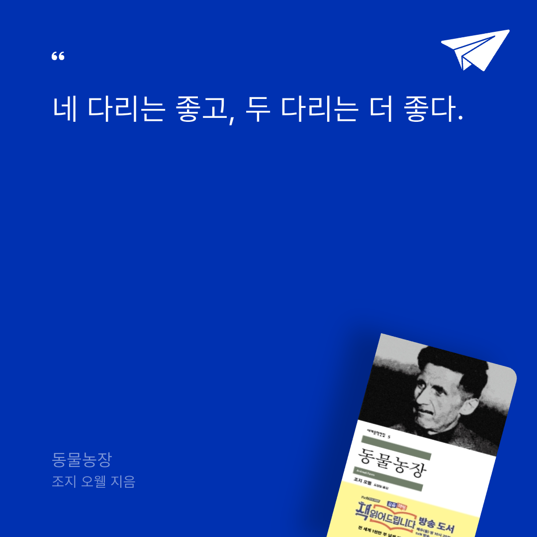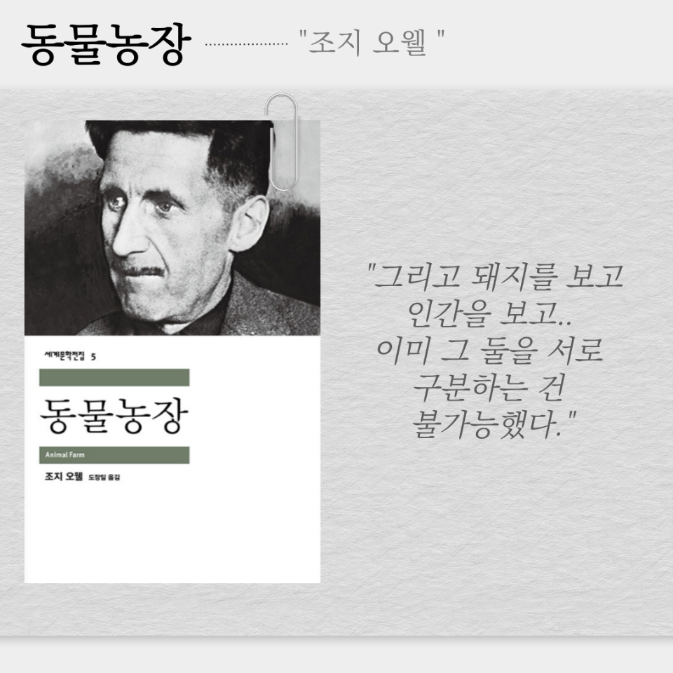 1945년에 간행된 조지 오웰의 대표작. 어떤 농장의 동물들이 늙은 돼지 메이저의 부추김에 빠져 농장주의 압제에 대항해 반란을 일으켜 인간의 착취가 없는 '모든 동물이 평등한 이상사회'를 건설한다. 그러나 돼지들이 지도자가 되어 다시 동물들을 압박하기 시작하는데...