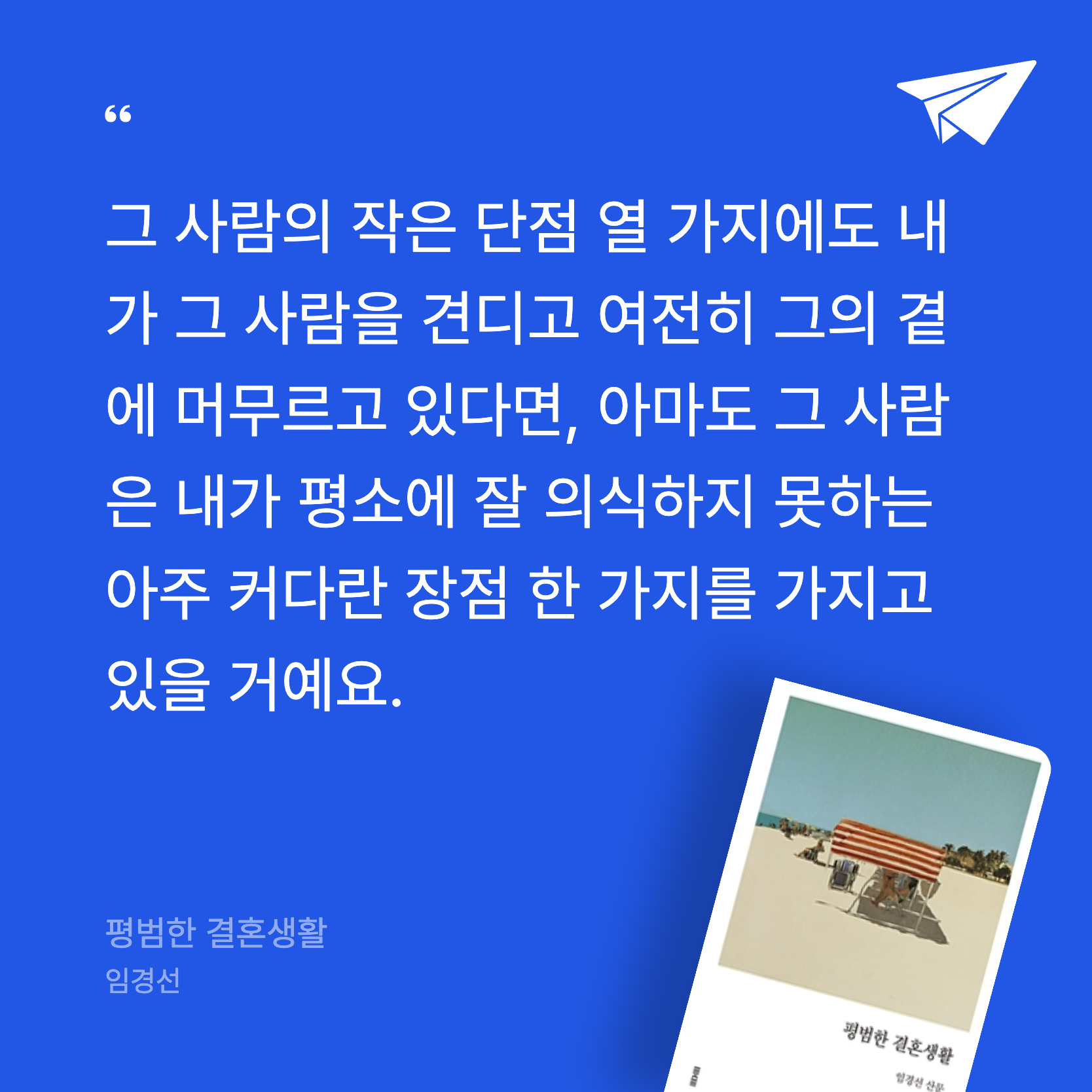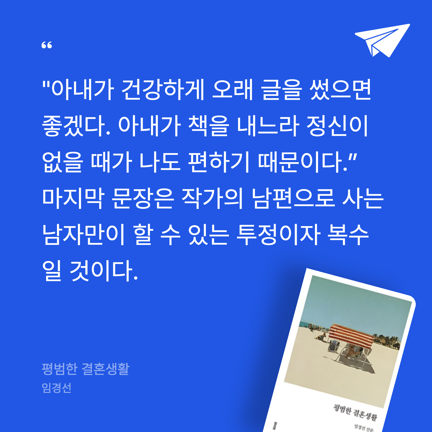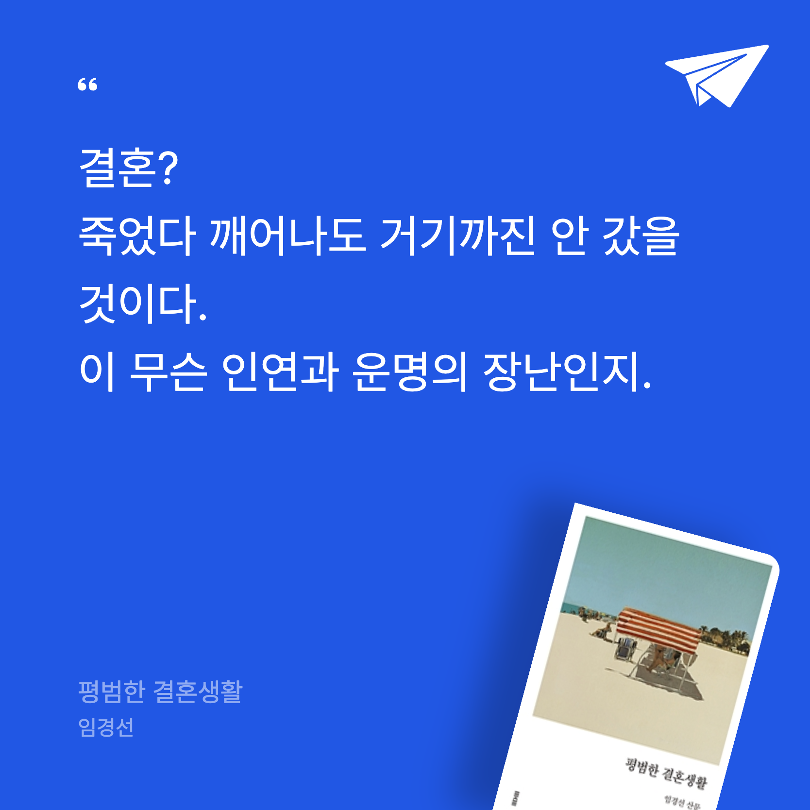 요약《평범한 결혼생활》은 작가 임경선이 2021년 3월 11일, 자신의 결혼 20주년 기념일에 맞춰 토스트 출판사에서 펴낸 산문집이다. 『가만히 부르는 이름』, 『태도에 관하여』 등으로 독자들에게 깊은 인상을 남긴 임경선은 이번 작품에서 20년간의 결혼생활을 솔직하고 섬세하게 풀어낸다. “결혼은 복잡하게 행복하고 복잡하게 불행하다”는 문장으로 시작하는 이 책은, 만난 지 3주 만의 청혼과 석 달의 짧은 연애 끝에 시작된 한 남자와의 20년 동행을 중심으로, 결혼의 진실과 그 안에