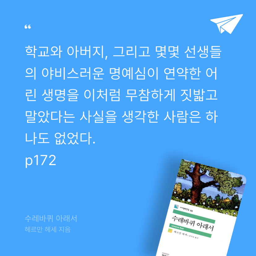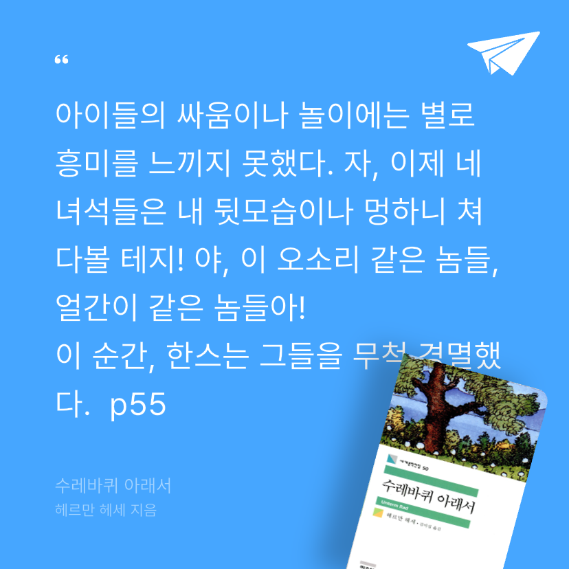 요약헤르만 헤세의 수레바퀴 아래서는 19세기 독일의 교육 시스템과 사회적 압박 속에서 자아를 잃고 비극으로 치닫는 한 소년의 이야기를 그린 소설이다. 주인공 한스 기벤라트는 독일의 작은 마을 칼프에서 태어난 재능 있는 소년이다. 그는 학문에 뛰어난 소질을 보여, 마을 사람들과 아버지의 기대 속에 신학교 입학 시험을 준비한다. 한스는 자연을 사랑하고 낚시를 즐기며 자유로운 영혼을 지녔지만, 부모와 선생님은 그의 재능을 신학자나 목사의 길로 이끌려 한다. 시험을 앞두고 그는 밤늦게까지 공부하며, 친구