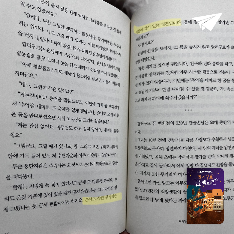요약『달러구트 꿈 백화점 2: 단골손님을 찾습니다』는 이미예가 2021년 7월 27일 팩토리나인에서 출간한 장편 판타지 소설로, 100만 부 이상 판매된 『달러구트 꿈 백화점』의 후속작이다(ISBN: 9791165343729). 📖 308쪽 분량의 이 책은 YES24 소설 분야에서 리뷰 평점 9.5를 기록하며, 2021년 교보문고와 예스24 상반기 베스트셀러 1위, 다수 서점의 ‘올해의 책’으로 선정된 전작의 인기를 이어갔다(). 1990년 부산에서 태어나 부산대 재료