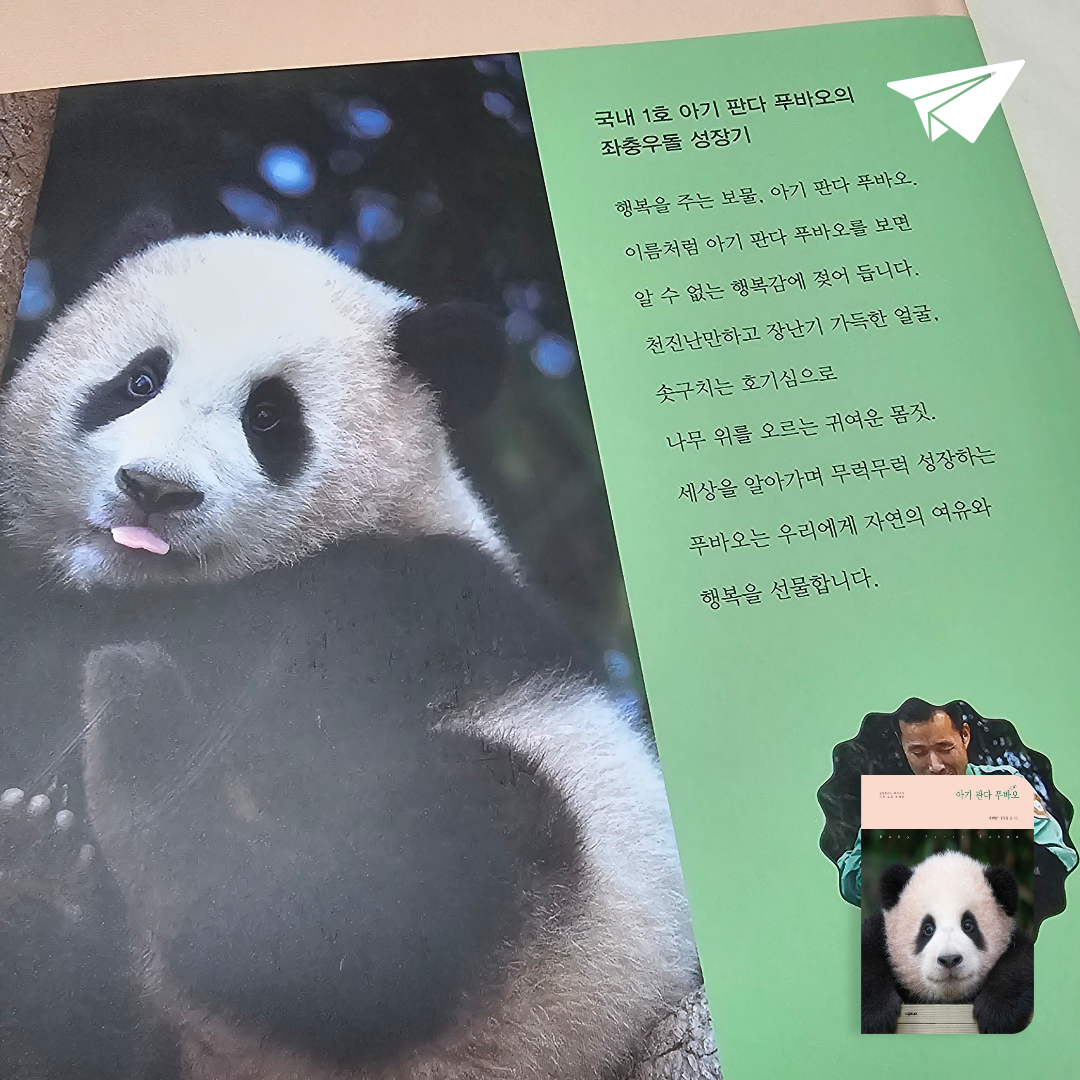 에버랜드 동물원 아기 판다 푸바오의 성장기를 담은 포토 에세이. 단순히 자이언트판다의 생태를 보여 주는 사진책이 아니라, 푸바오의 성장기를 따뜻한 시선으로 그려 나가고 있다. 자이언트판다를 지키기 위해 애쓰고 노력하는 사육사들의 피, 땀, 눈물도 함께 녹아 있는 책이다.
