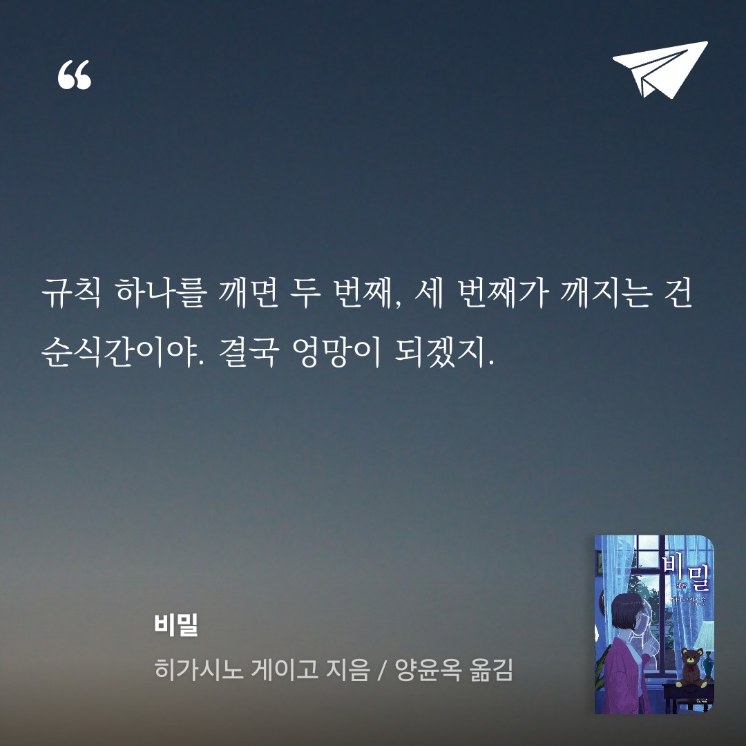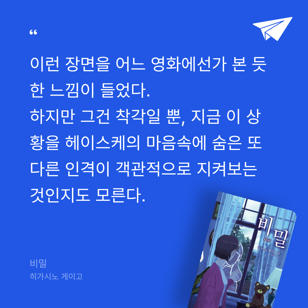 요약『비밀』은 히가시노 게이고가 1998년에 발표하고, 2021년 7월 21일 ㈜소미미디어에서 양윤옥 번역으로 출간된 장편소설로, 제52회 일본추리작가협회상을 수상한 작품이다(ISBN: 9791138400428). 📖 352쪽 분량의 이 소설은 YES24 소설 분야 베스트셀러로, 리뷰 평점 8.9를 기록했다. 히가시노 게이고는 『용의자 X의 헌신』, 『나미야 잡화점의 기적』으로 한국에서도 큰 사랑을 받은 일본 추리소설의 거장이다. 이 작품은 교통사고로 아내를 잃은 스기타 헤이스케가 딸 모나미의 몸에 아내 나오
