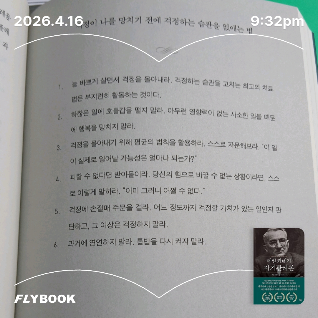 요약《데일 카네기 자기관리론》(원제: How to Stop Worrying and Start Living)은 데일 카네기가 현대인의 불안과 스트레스를 극복하고 긍정적인 삶을 살기 위한 실용적 지침을 제시한 자기계발서다. 🌟 1948년에 출간된 이 책은 《인간관계론》과 함께 그의 대표작으로, 수십 년간 전 세계적으로 사랑받으며 1,500만 부 이상 판매되었다. 카네기는 걱정의 해악을 분석하고, 이를 줄이는 구체적 방법을 사례와 함께 제시한다. 그의 문체는 따뜻하고 대화적이어서, 마치 친구와 이