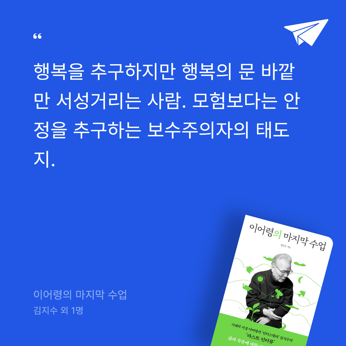 요약이어령의 마지막 수업은 한국의 대표 지성 이어령과 인터뷰어 김지수가 2019년 가을부터 1년간 진행한 16번의 대화를 엮은 책이다. 🌟 오랜 암 투병으로 죽음을 곁에 둔 이어령은 “이번이 마지막 인터뷰”라며, 삶과 죽음, 사랑, 용서, 종교, 과학 등 인생의 본질적 주제를 논한다. 2019년 김지수의 인터스텔라에 실린 그의 인터뷰는 “마이 라이프는 기프트였다”는 메시지로 7천여 댓글을 모으며 큰 반향을 일으켰다. 이를