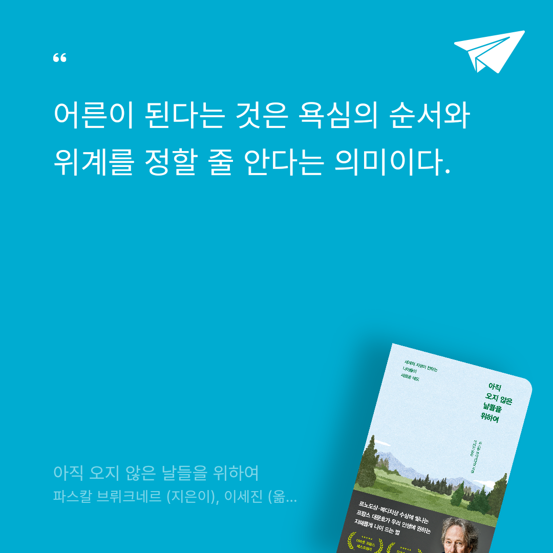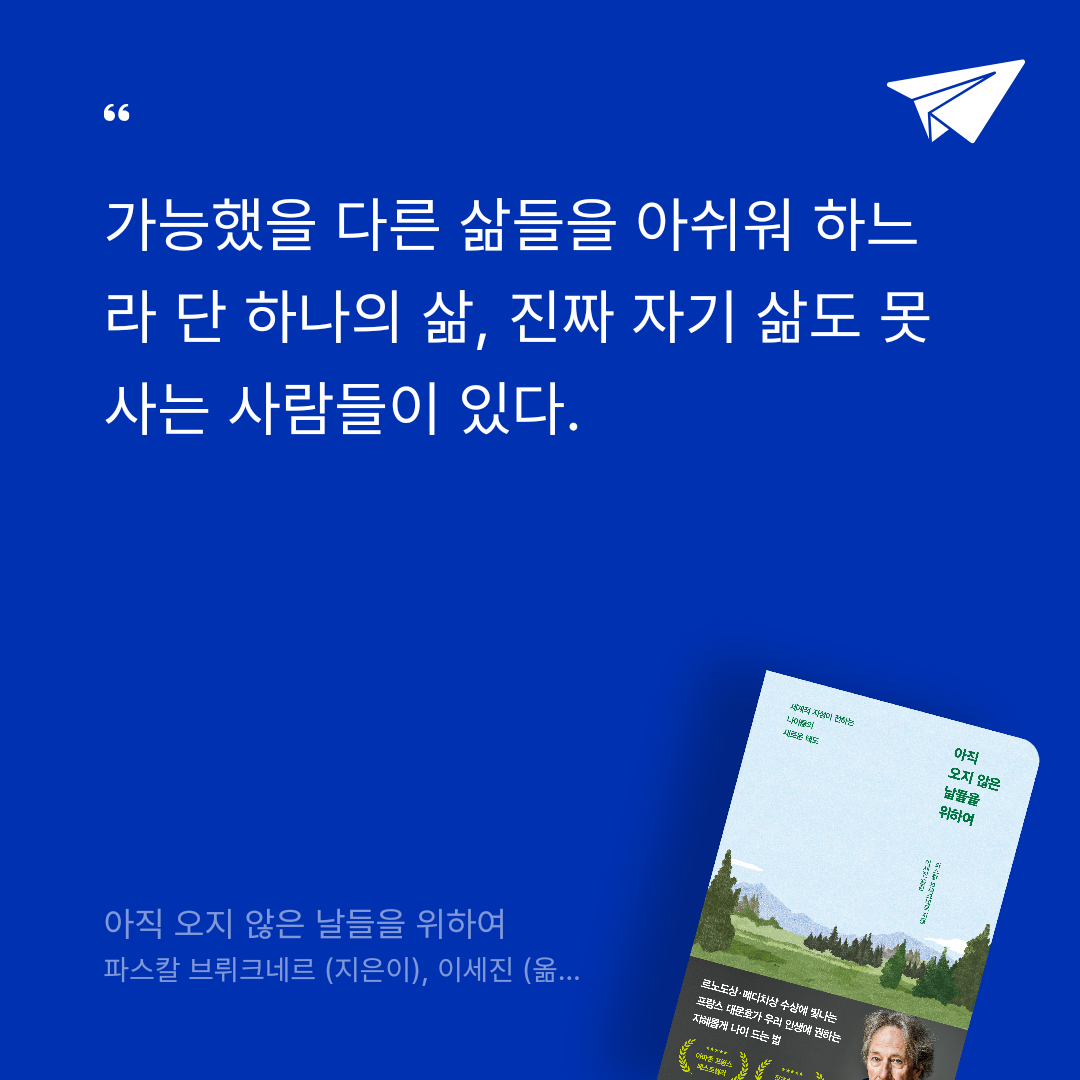 요약《아직 오지 않은 날들을 위하여》(원제: Une brève éternité, A Brief Eternity: The Philosophy of Longevity)는 프랑스 철학자이자 소설가 파스칼 브뤼크네르가 2021년 인플루엔셜을 통해 이세진 번역으로 한국어판(ISBN: 9791168340039)을 출간한 인문 에세이다. 메디치상, 르노도상 등 프랑스 주요 문학상을 수상한 저자는 백세시대를 맞아 ‘나이 듦’의 새로운 철학을 제시한다.