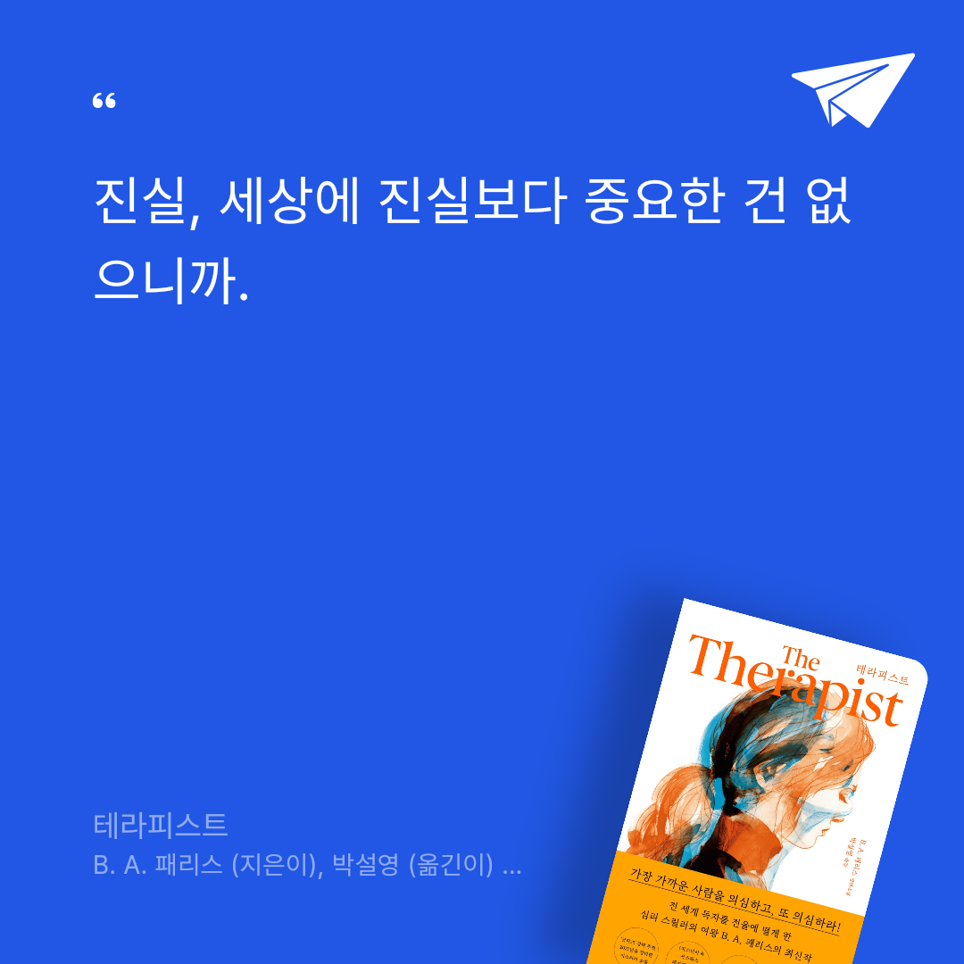 요약《테라피스트》(The Therapist)는 영국 작가 B. A. 패리스(B. A. Paris)의 심리 스릴러 소설로, 2021년 모모에서 박설영 번역으로 출간되었다(ISBN: 9791191043518). 《비하인드 도어》로 세계적 베스트셀러 작가가 된 패리스의 다섯 번째 작품으로, 런던의 고급 주택 단지 ‘더 서클’을 배경으로, 주인공 앨리스 도슨의 불안과 의심이 촉발하는 긴장감 넘치는 이야기를 그린다. 과거의 트라우마와 살인 사건의 비밀을 파헤치는 과정에서