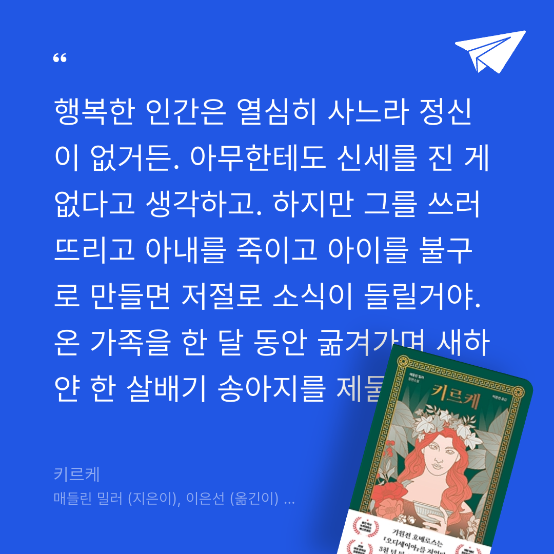 소설가 매들린 밀러의 최신작. 『아킬레우스의 노래』가 서양문학사상 최초이자 최고의 걸작인 호메로스의 두 편의 서사시 중에서 『일리아스』를 현대적으로 각색한 것이었다면, 『키르케』는 호메로스의 또다른 걸작 『오디세이아』에서 영감을 받아 쓴 작품이다.