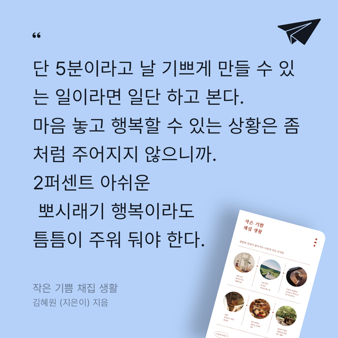 '언젠가는 좋아질 테니까'라는 생각으로 살다 보면 놓치는 게 많아진다. <작은 기쁨 채집 생활>은 언제 올지 모르는 '좋은 때'를 기다리며 막연한 날들을 버티고 있는 이들과 함께 나누고 싶은 책이다.