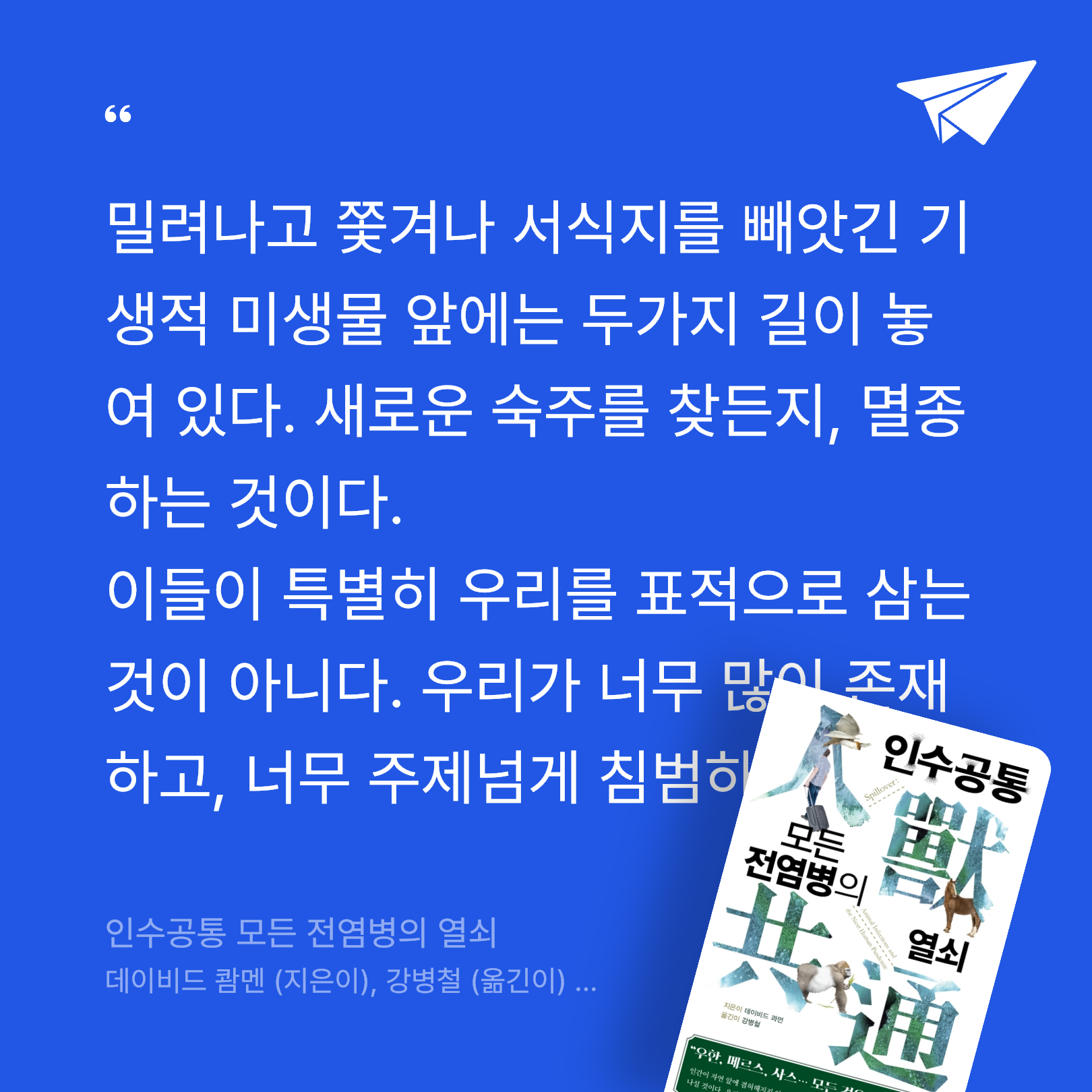 요약이 책은 현대 인류가 직면한 가장 위협적인 생물학적 재앙인 '인수공통전염병'의 기원을 추적하는 거대한 과학 탐사 보고서입니다. 저자 데이비드 쾀멘은 에볼라, 사스, 니파 바이러스, 그리고 인플루엔자 등 인류를 공포로 몰아넣었던 치명적인 질병들이 어디서 시작되어 어떻게 인간의 몸으로 건너오게 되었는지를 집요하게 파헤칩니다. 🧬